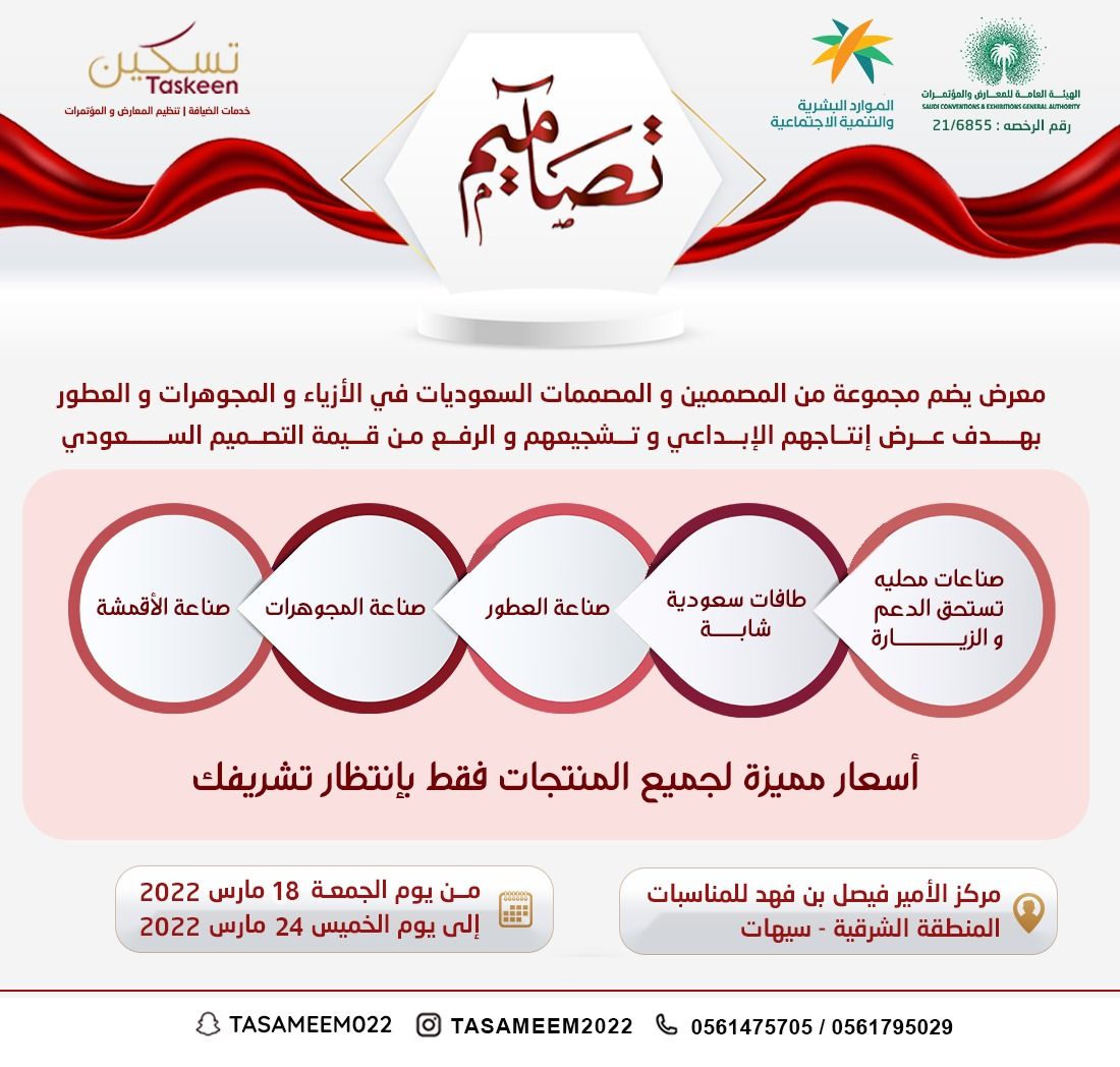 ويضم معرض «تصاميم» مجموعة من المصممين والمصصمات السعويات في الأزياء والمجوهرات والعطور بهدف عرض إنتاجهم الإبداعي وتشجيعهم والرفع من قيمة التصميم السعودي.