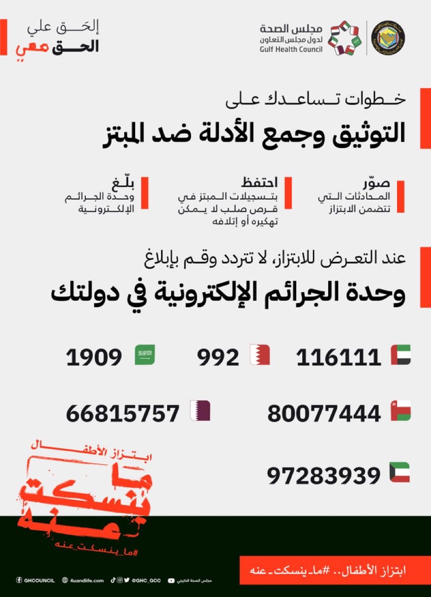 وأوضح مجلس الصحة الخليجي الأرقام الخاصة بأستقبال بلاغات الجرائم الألكترونية في جميع دول الخليج وهي 116111 في دولة الإمارات، و992 في مملكة البحرين، و1909 في السعودية، و80077444 في سلطنة عُمان، و66815757 في دولة قطر، و97283939 في دولة الكويت.