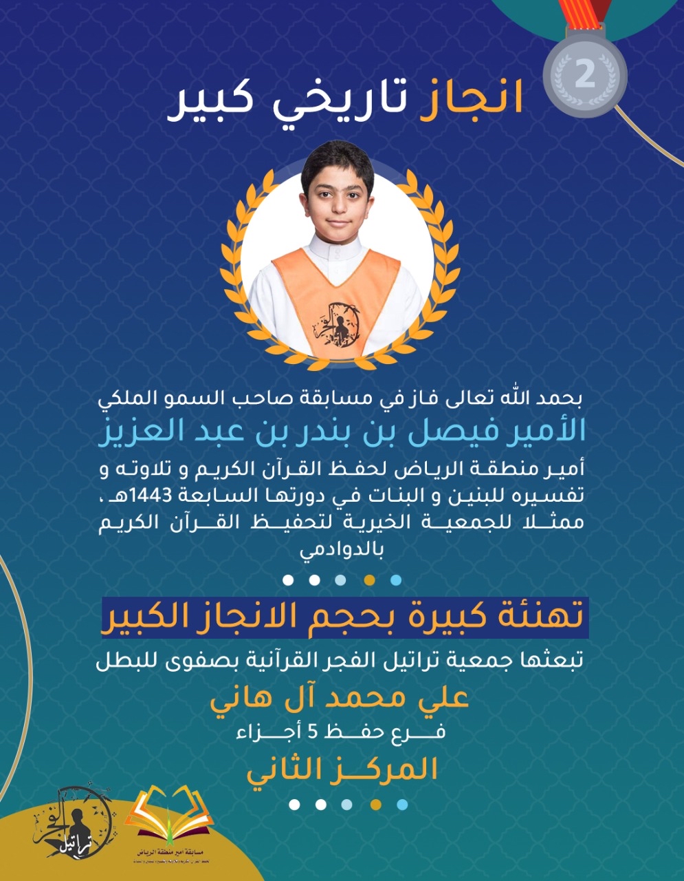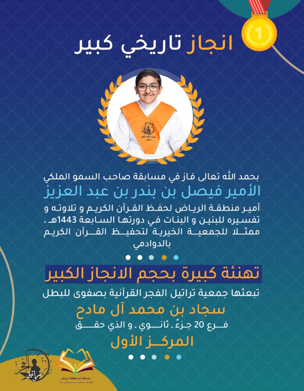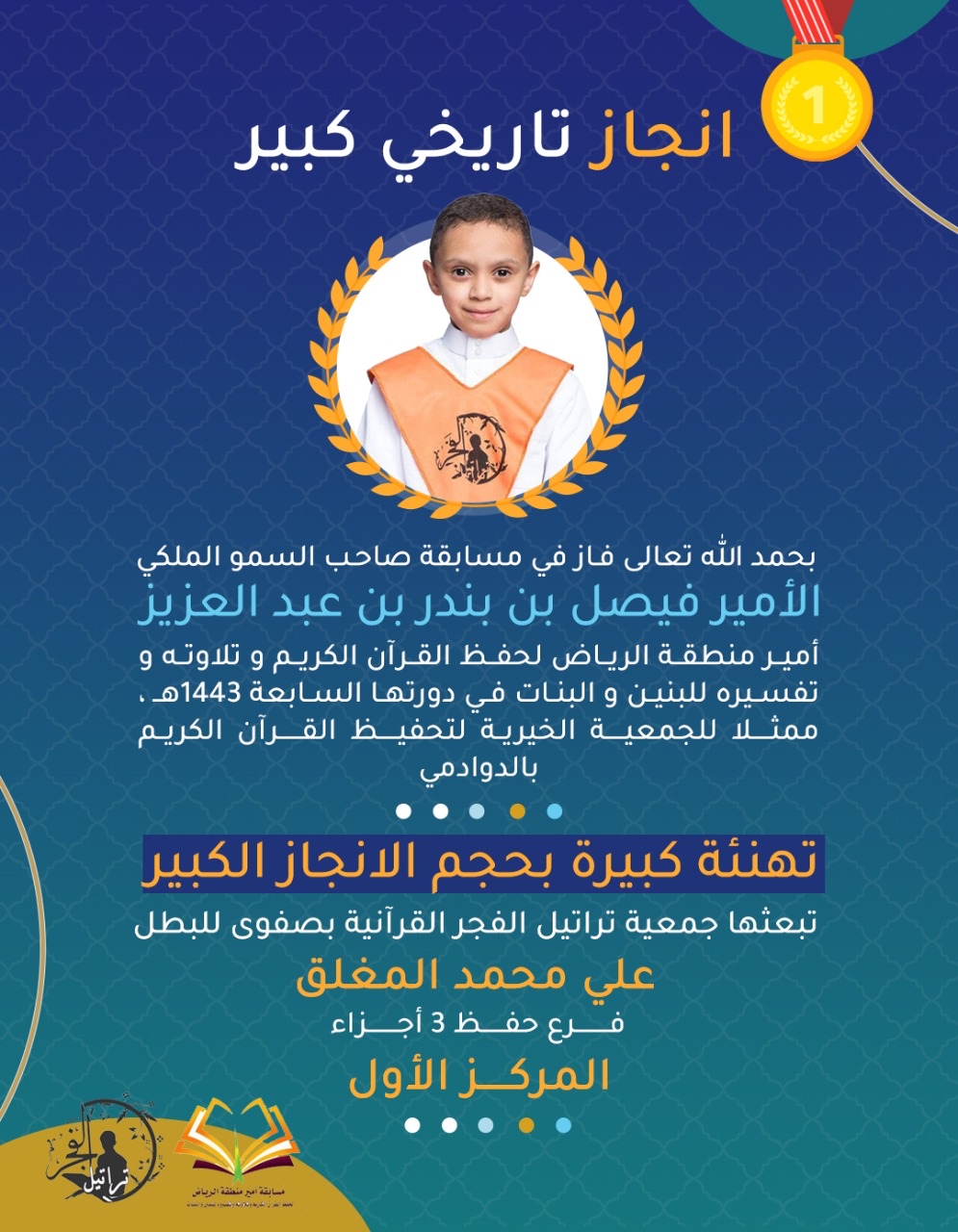 حقق أشبال تراتيل الفجر بصفوى المراكز الأولى في مسابقة الأمير فيصل بن عبد العزيز أمير منطقة الرياض في دورتها السابعة لحفظ القرآن الكريم وتلاوته وتفسيرة للبنين والبنات.