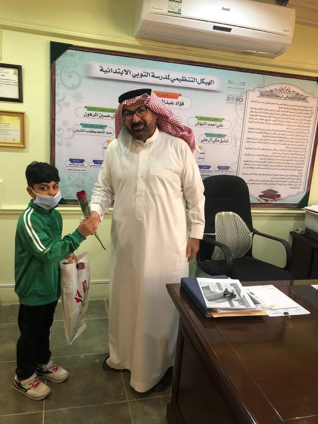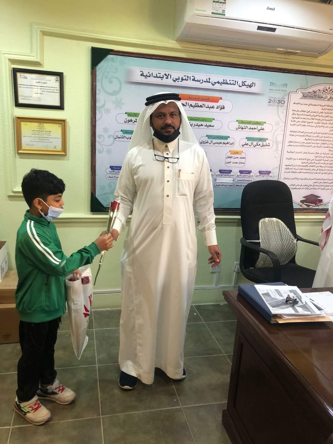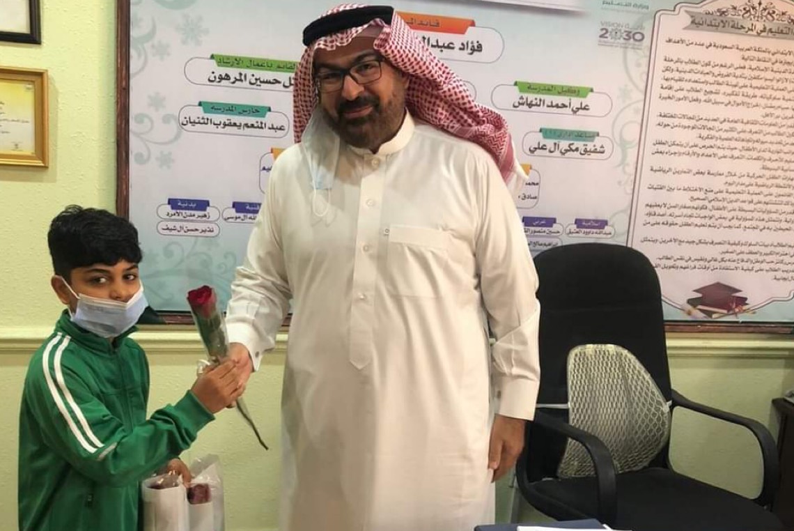 قدم الطالب ”فراس الرمضان“، من الصف الرابع بالمدرسة الابتدائية بالتوبي، ورودًا لجميع المدرسين الذين قاموا بتدريسه، وكذلك إدارة المدرسة، وذلك بعد عودة الدراسة حضوريا للجميع.