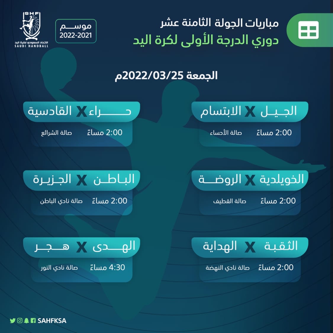 وستنطلق المباريات عند الساعة 2:00 مساءً، حيث يحل المتصدر فريق الابتسام ضيفاً على الجيل في صالة مدينة الأمير عبد الله بن جلوي الرياضية بالأحساء، وفي نفس التوقيت، يلتقي الخويلدية مع الروضة على صالة مدينة الأمير نايف بن عبد العزيز الرياضية بالقطيف، ويلعب الباطن على صالته بحفر الباطن مع الجزيرة، ويتواجه الثقبة مع الهداية على صالة نادي النهضة بالدمام.