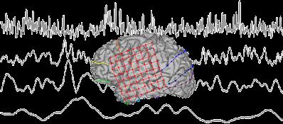 الشكل: تخطيط كهرباوي قشري[1] . مثال على شبكة التخطيط الكهرباوي القشري الموضوع على عمليات محاكاة السطح القشري للتصوير بالرنين المغناطيسي «A» لأحد المشاركين في التجربة. أمثلة على نشاط عالي التردد لتجربة مفردة «HFA» لقطب كهربي مظلل باللون الأسود في «A». تجارب فردية تمثل أمثلة على ترديد الجهر بالكلام «B» وتكرار الكلام الداخلي «C»