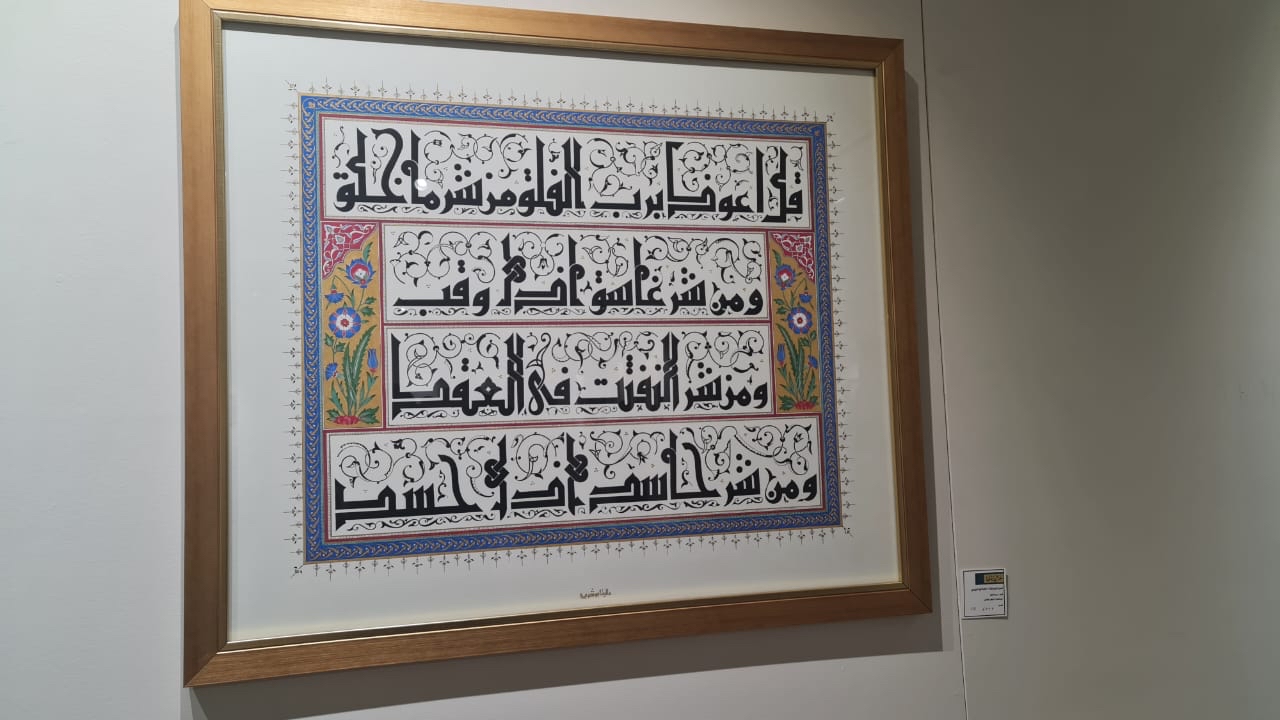 واحتوى المعرض ”جماليات الخط“ الذي افتتح مساء الأربعاء ويستمر لمدة 9 أيام على 58 عملًا متعددًا من الخطوط العربية واللوحات الزخرفية.