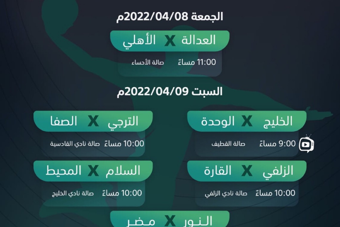 وستكون باقي لقاءات الجولة عند الساعة 10:00 مساءً، إذا يلعب الترجي مع الصفا على صالة نادي القادسية بالخبر، ويستضيف فريق الزلفي على صالته بالزلفي نظيره القارة، فيما يلعب السلام مع المحيط على صالة نادي الخليج بسيهات.
