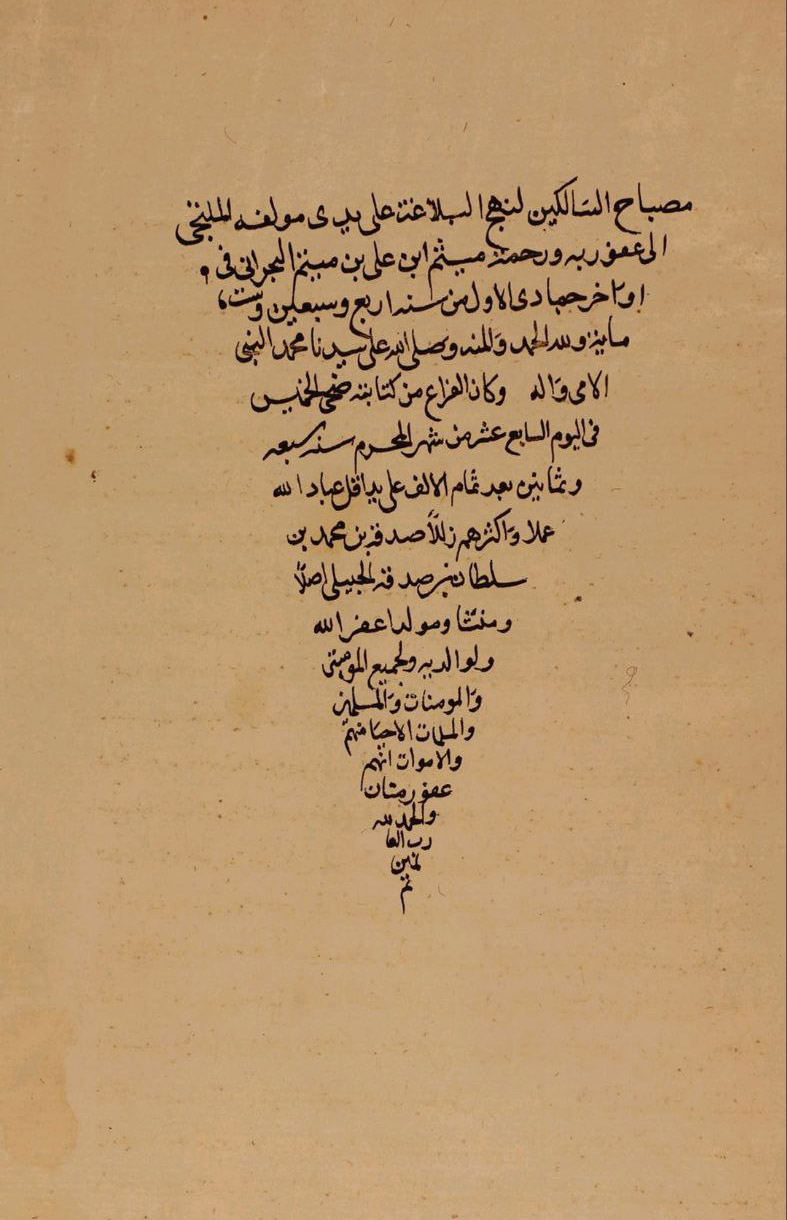ختمها الناسخ: >وكان الفراغ من كتابته ضحى الخميس في اليوم السابع عشر من الشهر المحرم سنة سبع وثمانين بعد تمام الألف على يد أقل عباد الله عملاً وأكثرهم زللاً صدقة بن محمد بن سلطان بن صدقة الجبيلي أصلاً ومنشأً ومولداً، غفر الله له ولوالديه ولجميع المؤمنين والمؤمنات والمسلمين والمسلمات الأحياء منهم والأموات، أنه غفورٌ منان والحمد لله رب العالمين<.