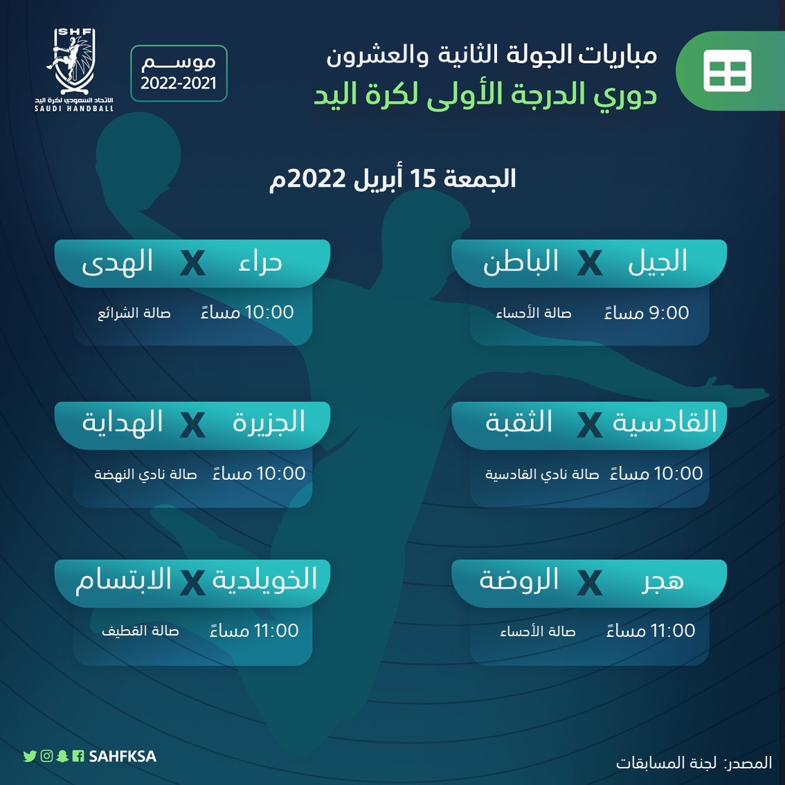 تختتم اليوم الجمعة 15 أبريل 2022م منافسات بطولة دوري أندية الدرجة الأولى لكرة اليد للموسم الرياضي 2021-2022م، بإقامة 6 مباريات ضمن الجولة الثانية والعشرون والاخيرة من منافسات الدوري.