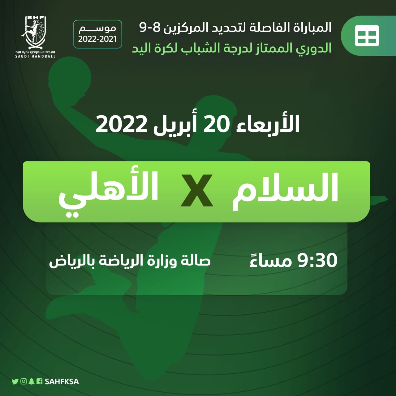 يلتقي فريقا السلام والأهلي يوم غدًا الأربعاء، عند الساعة 9:30 مساءً، على صالة وزارة الرياضة بالرياض، في المباراة الفاصلة التي تجمعهم ضمن بطولة الدوري الممتاز لكرة اليد لدرجة الشباب.
