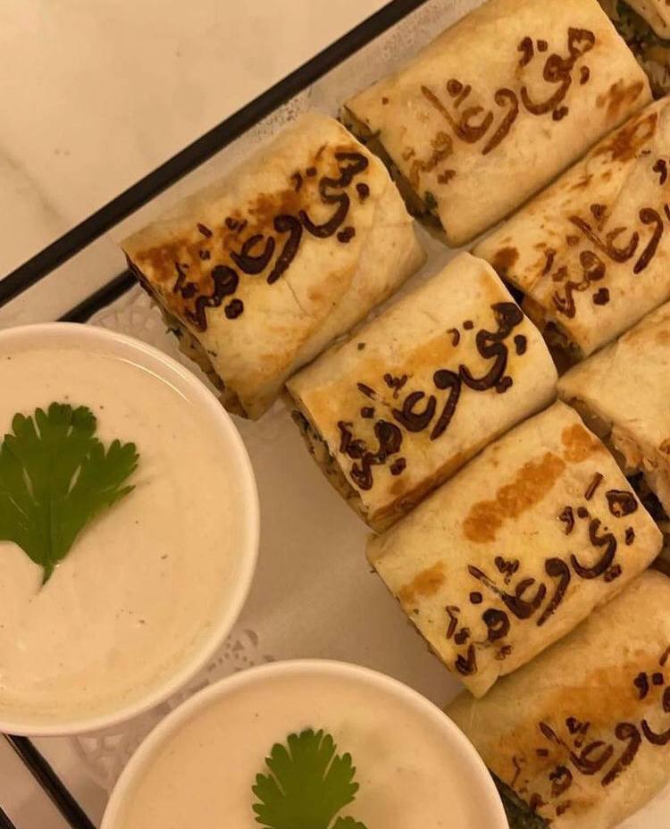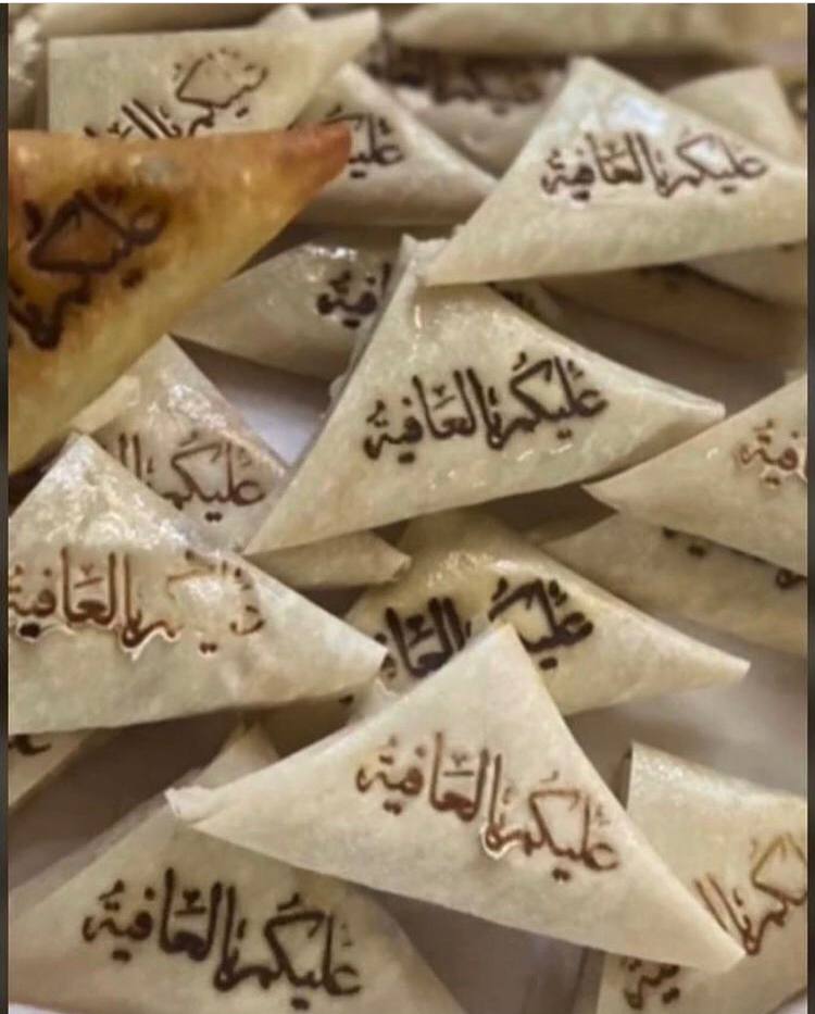 وعمدت بعض السيدات إلى طباعة عبارات عربية على عجينة السمبوسة عبر أداة معدنية يتم تحميتها على نار عالية والكتابة بها كما القلم، أو تكون الأداة بها قالب محفور بعبارات أو أحرف عربية.