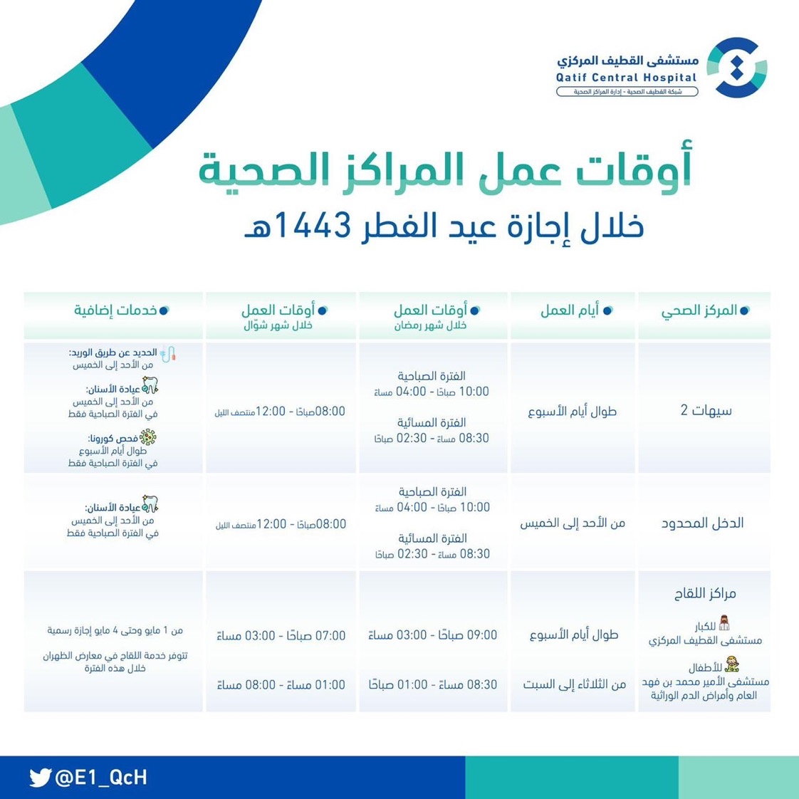 وبينت أن مركز صحي سيهات «2» يعمل طوال الأسبوع من الساعة 10 صباحا وحتى 4 مساء، ومن الساعة 8:30 مساء وحتى 2:30 صباحا، ومن الساعة 8 صباحا إلى 12 منتصف الليل خلال شهر شوال.