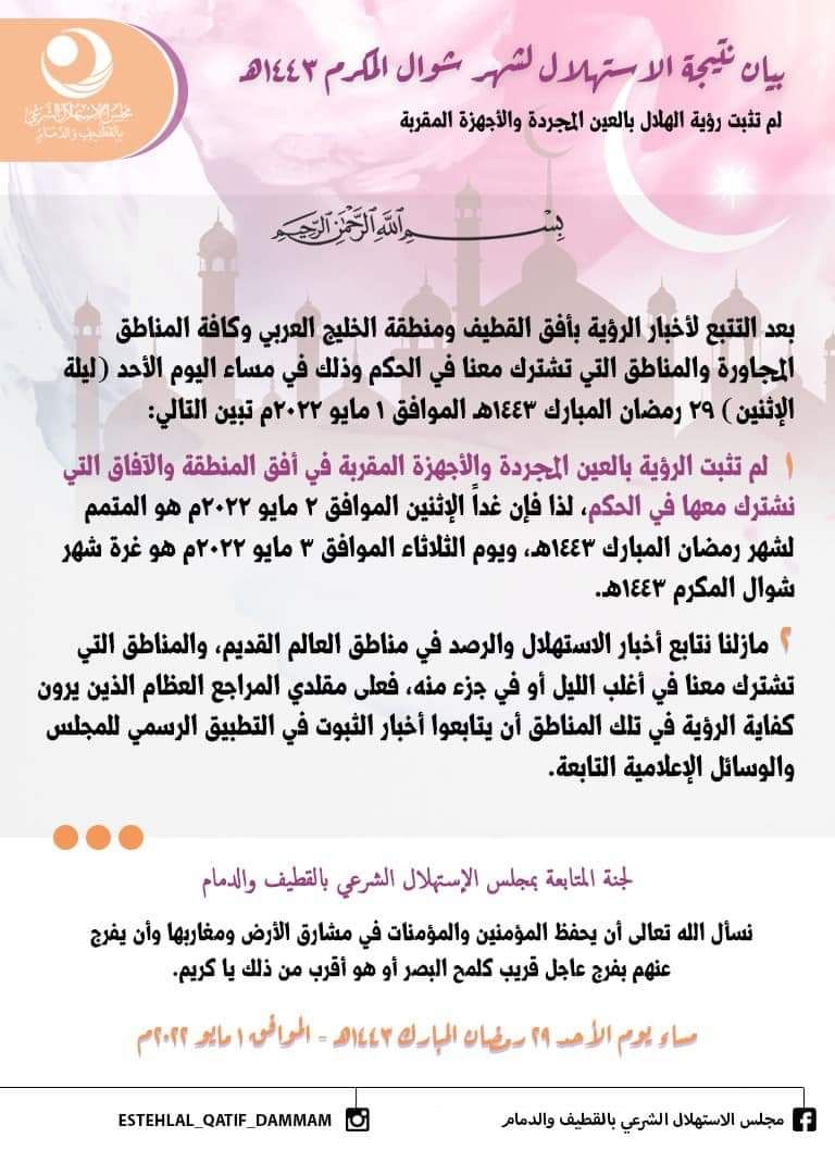 أعلن مجلس الاستهلال الشرعي بالقطيف والدمام أن يوم غد الاثنين المتمم لشهر رمضان المبارك وأن يوم الثلاثاء اول ايام عيد الفطر المبارك.