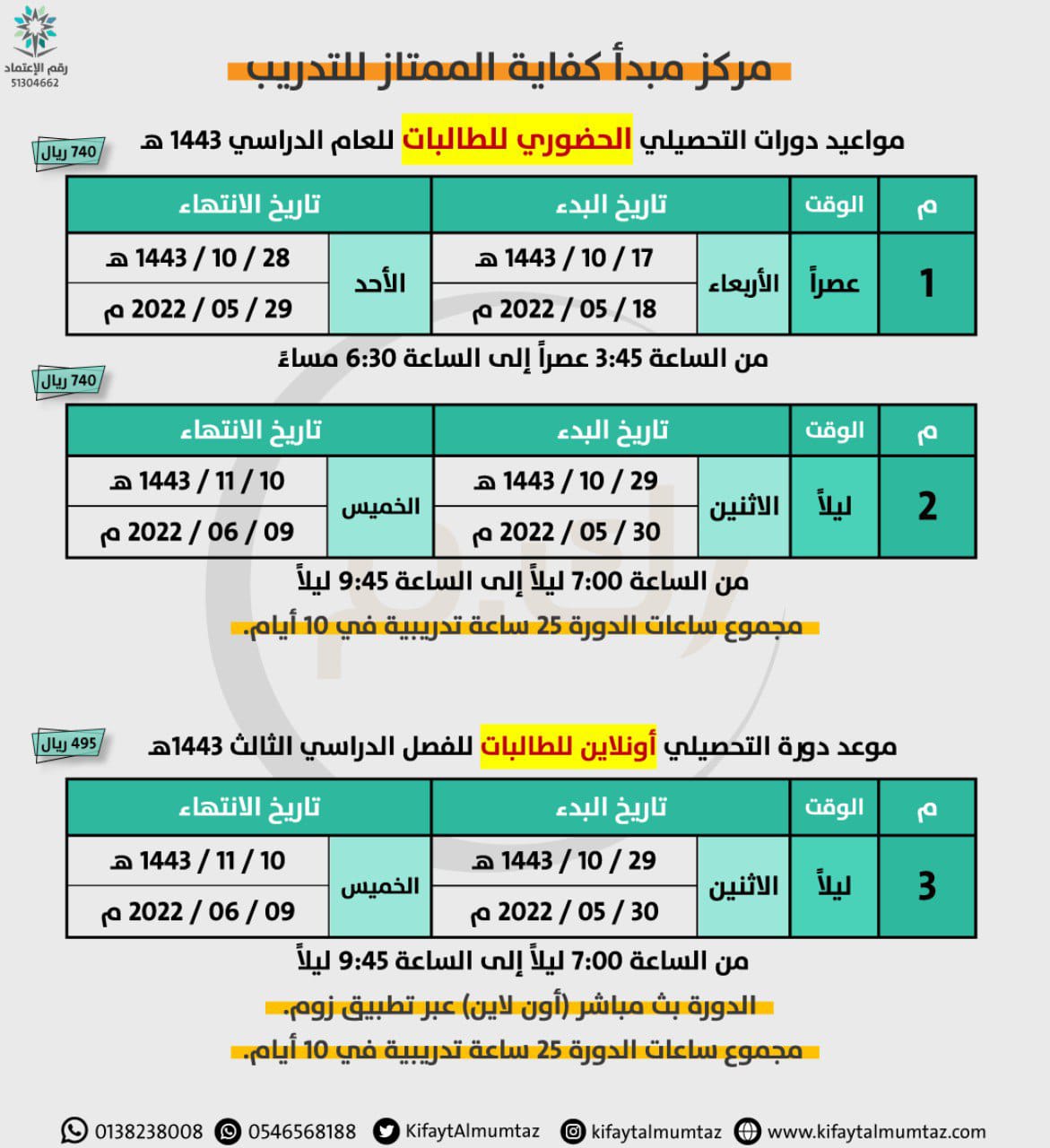 مركز مبدأ كفاية الممتاز للتدريب بإشراف الأستاذ/ ناصر المسباع يعلن عن استمرار التسجيل أقوى دورات الموسم للفصل الدراسي الثالث: