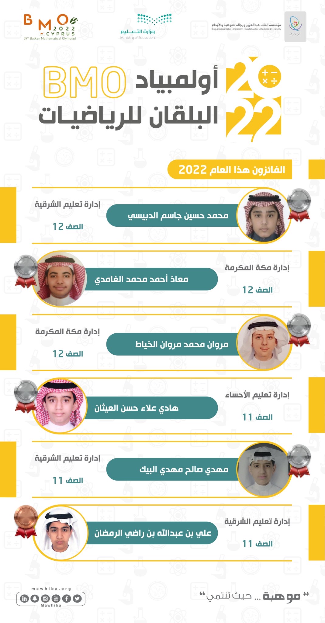 اعتلى المنتخب السعودي للرياضيات منصات التتويج في أولمبياد البلقان للرياضيات 2022 المقامة في قبرص، بعد الفوز ب 6 ميداليات: ”5 فضيات وبرونزية واحدة“، بمشاركة 93 طالباً، يمثلون 16 دولة.