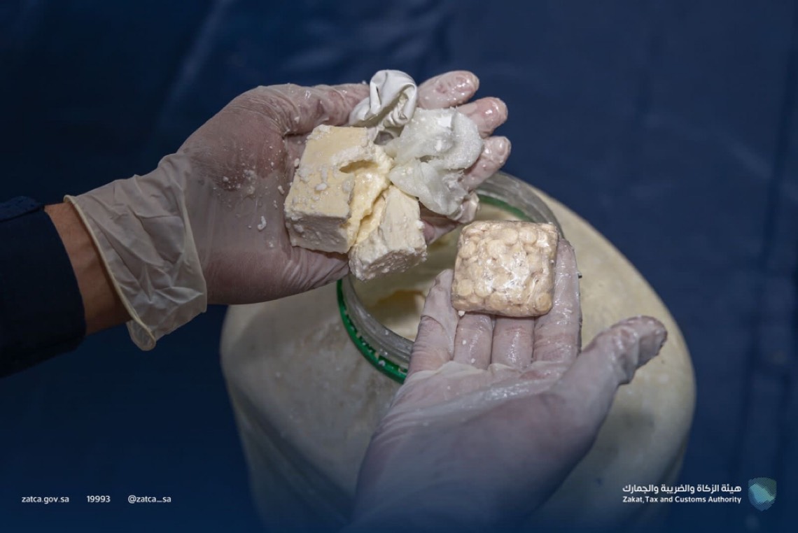 وأوضحت الهيئة أنه أثناء إجراء عملية الكشف والمعاينة لإحدى المركبات القادمة من نوع ”خصوصي“، عُثر على 29,000 حبة كبتاجون، كانت مُخبأة بطريقة فنية، وذلك بإخفاء الحبوب في قفازات بلاستيكية ووضعها داخل عُلب زجاجية تحتوي على أجبان، ومن ثم وضعها ضمن الأمتعة التي يحملها المُهرب في المركبة.
