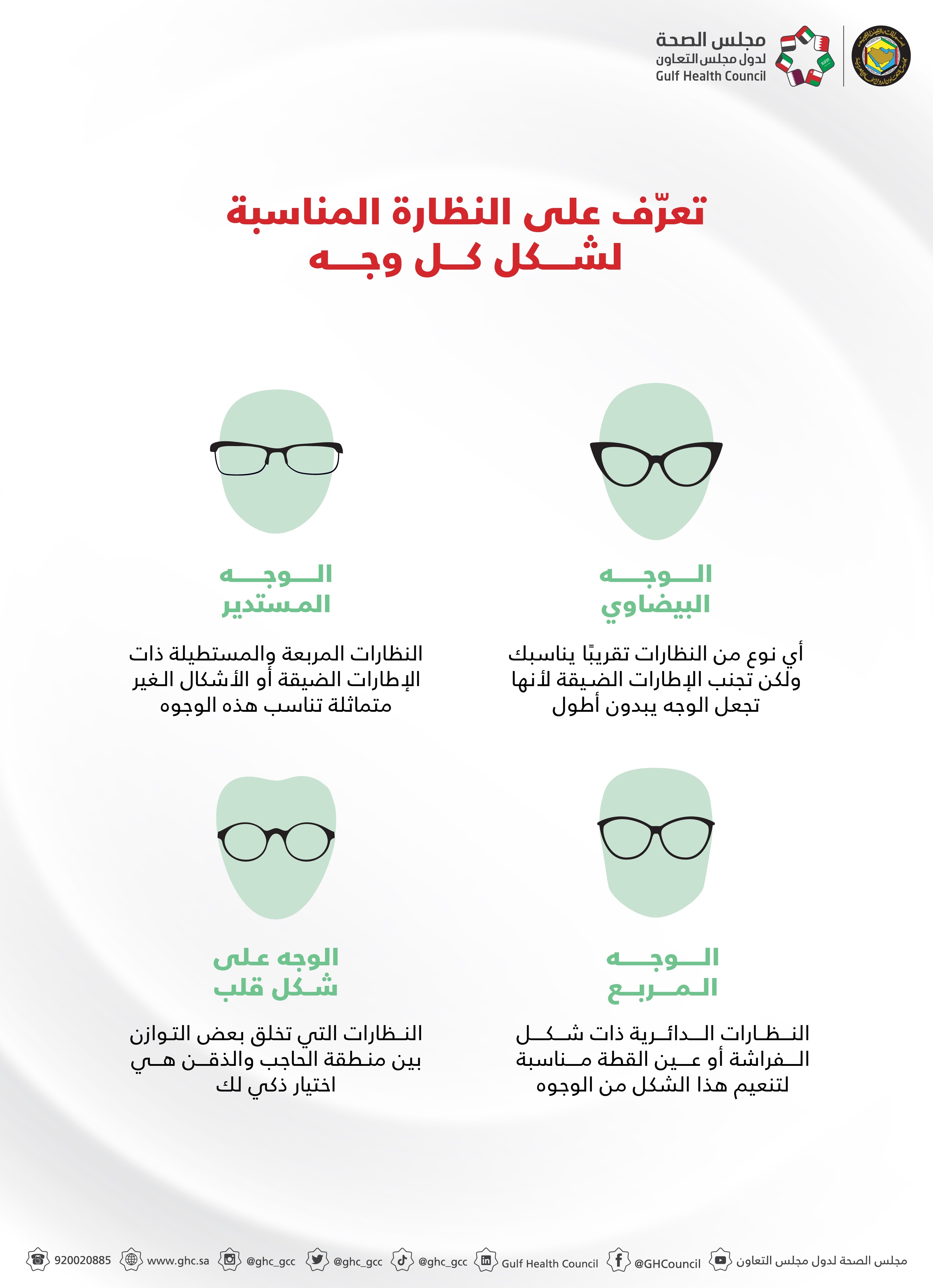 قال مجلس الصحة الخليجي: إن إطارات النظارات تختلف باختلاف شكل الوجه، وإن الوجه البيضاوي يتناسب معه أي نوع من النظارات، ولكن يجب أن يتجنب الإطارات الضيقة؛ لأنها تجعل الوجه يبدو طويلاً.