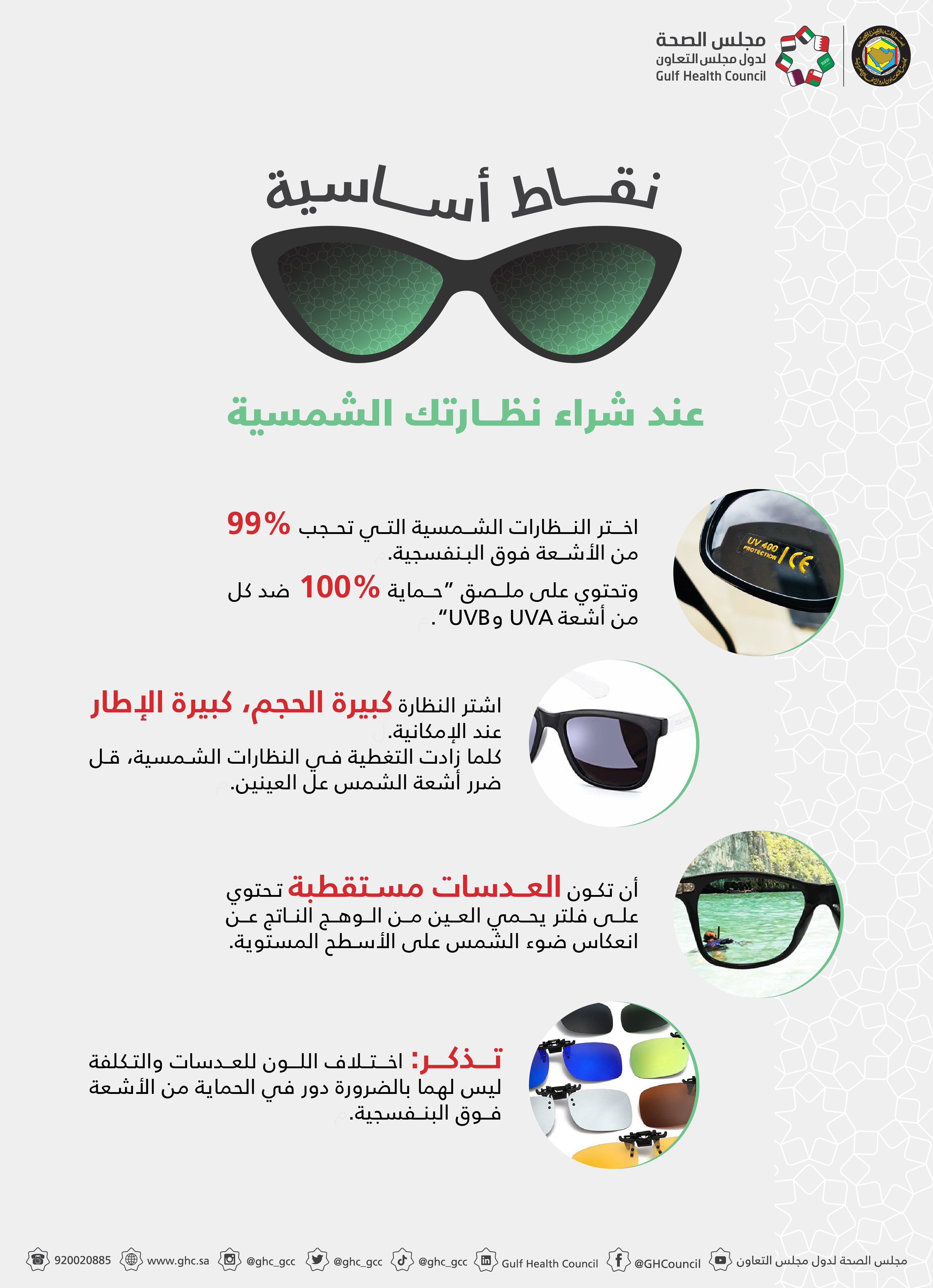 وأشار الصحة الخليجي إلى أن العدسات المستقطبة تحتوي على فلتر يحمي العين من الوهج الناتج عن انعكاس ضوء الشمس على الاسطح المستوية، مشددًا على أن اختلاف لون العدسات والتكلفة ليس لهما بالضرورة دور في الحماية من الاشعة فوق البنفسجية.