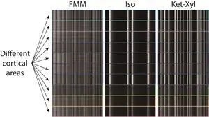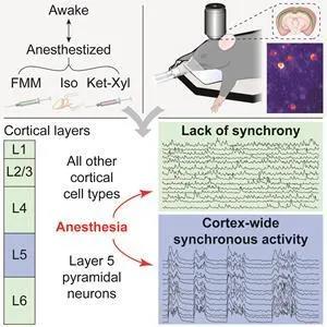 تصوير أنواع الخلايا مختلفة في قشرة الفأر الدناغية، ومقارنة نشاطها أثناء اليقظة والتخدير، وجد المؤلفون أن الخلايا العصبية الهرمية من الطبقة 5 فقط تظهر نشاطا متزامنا.