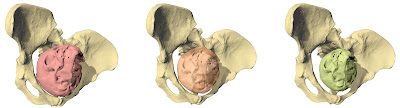 الصورة: محاكاة ولادة فصيلة لوسي «أسترالوبيثكس أفارينسيس» بثلاثة أحجام مختلفة لحجم رأس الجنين. فقط حجم دماغ بحد أقصى 30 بالمائة من حجم رأس الشخص الراشد «يمين» يناسب قناة الولادة.