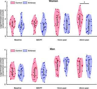 العناق بين شريكي الحياة يقلل من إفراز الكورتيزول الناجم عن الضغط النفسي الحاد لدى النساء ولكن لم يُلاحظ تأثير له في الرجال