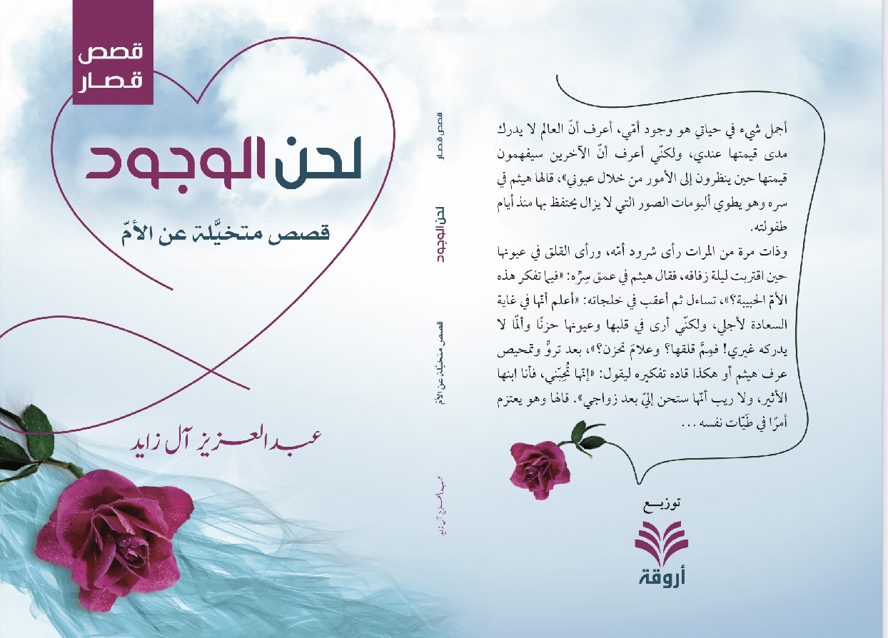 صدر حديثا عن دار أروقة للدراسات والنشر بالأردن مجموعة قصصية للأديب والقاص السعودي عبد العزيز آل زايد، بعنوان «لحن الوجود.. قصص متخيلة عن الأم»، وهي عبارة قصص تربوية اجتماعية تحكي جهود الأمهات ومعاناتهن في الحياة، تتناول مفردة البر، بطريقة ذكية مبطنة، لإيصال ما تكتويه الأمهات من أجل فلذات أكبادهن، قصص متخيلة تلامس واقع الأُسَر، وتقلابات الزمان على أفئدة الأمهات.