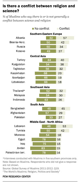الشكل: نسبة المسلمين في عدد من الدول الذين قالوا أنه لا يوجد تعارض أو يوجز تعارض بين العلم والدين
