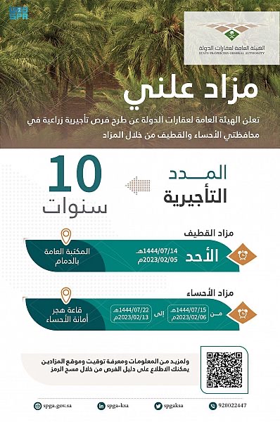 في حين يبدأ مزاد العقارات الزراعية بمحافظة الأحساء خلال الفترة 15 - 22 / 07 / 1444ه الموافق 06 - 13 / 2 / 2023م، وذلك في قاعة هجر للمناسبات في مجمّع الدوائر الحكومية الأول بالأحساء.