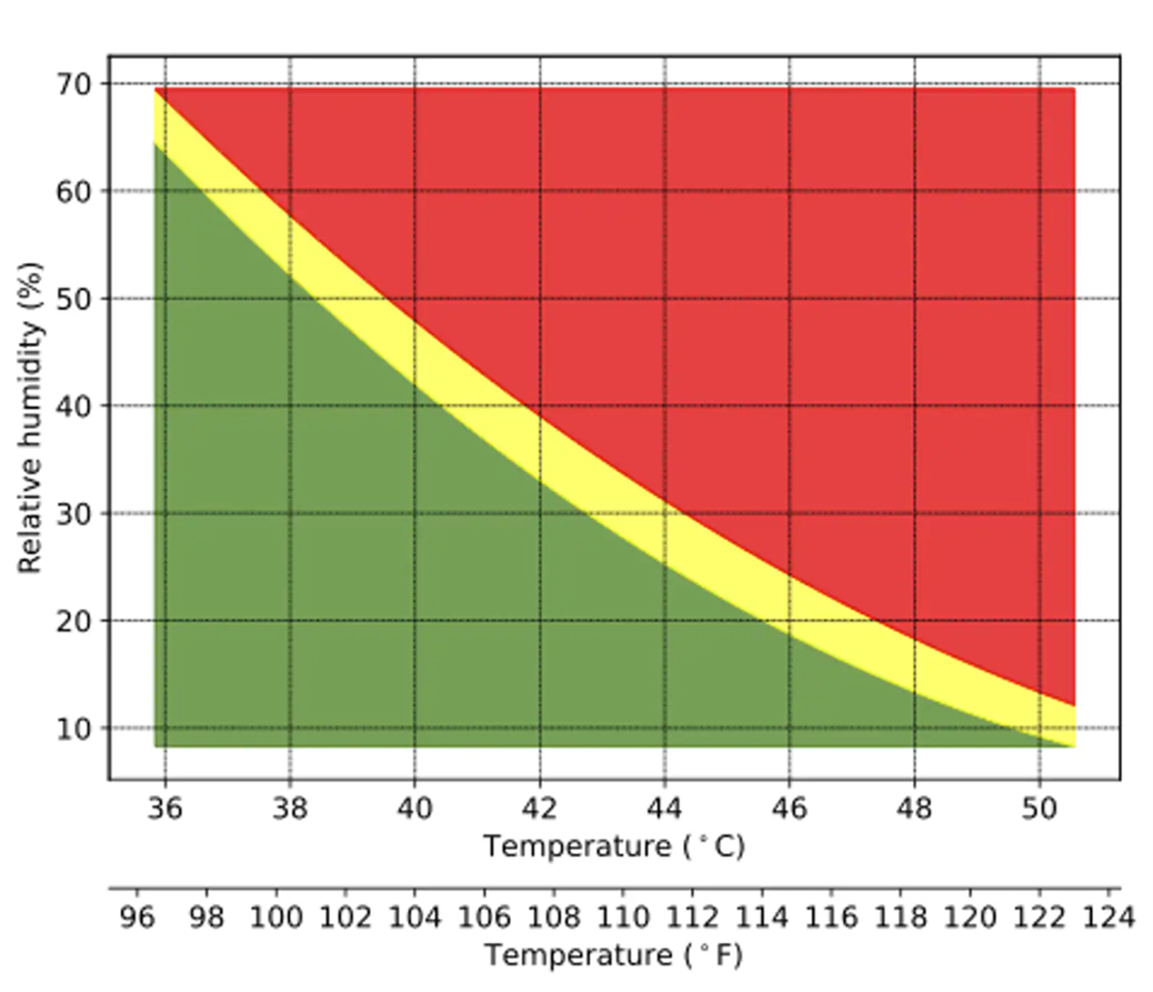 الإجابة على الاستفسار تتجاوز درجة الحرارة التي نراها على الترمومتر. حيث تتعلق أيضًا بالرطوبة. أثبت بحثنا [2] أن درجة الحرارة المصحوبة بنسبة رطوبة عالية يمكن أن تصل إلى حد الخطورة أسرع مما اعتقده باحثون في السابق [3] .