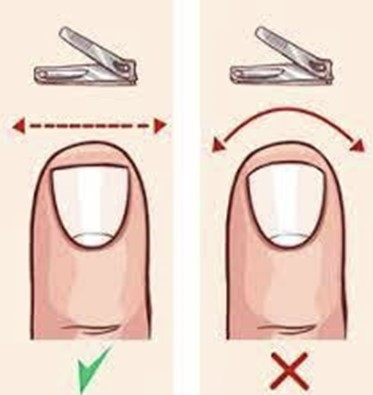 الطريقة الصحيحة، لتقليم الأظفر بشكل مستقيم «الصورة على اليسار» لا على شكل منحي «الصورة على اليمين».