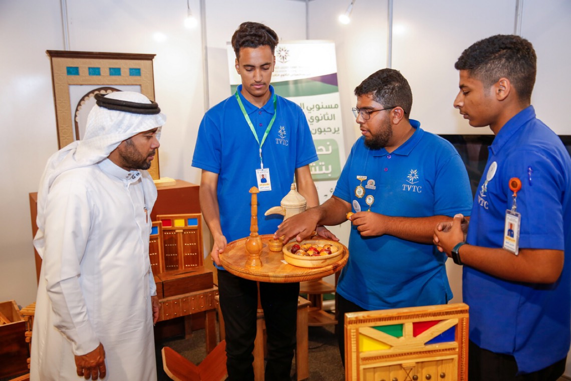 ويُسهم طلبة المعهد الصناعي الثانوي الثالث بالأحساء، في تعريف الزوار بما يقدمه المعهد من منتجات خشبية تُصنع بأيدي وطنية مدربة، ومن ذلك نماذج تُحاكي الأبواب التراثية القديمة ودروازة الكوت والمقاعد والصناديق، ومجسم «الضيافة الأحسائية»، وتحظى تلك النماذج بطلب كبير لشرائها.