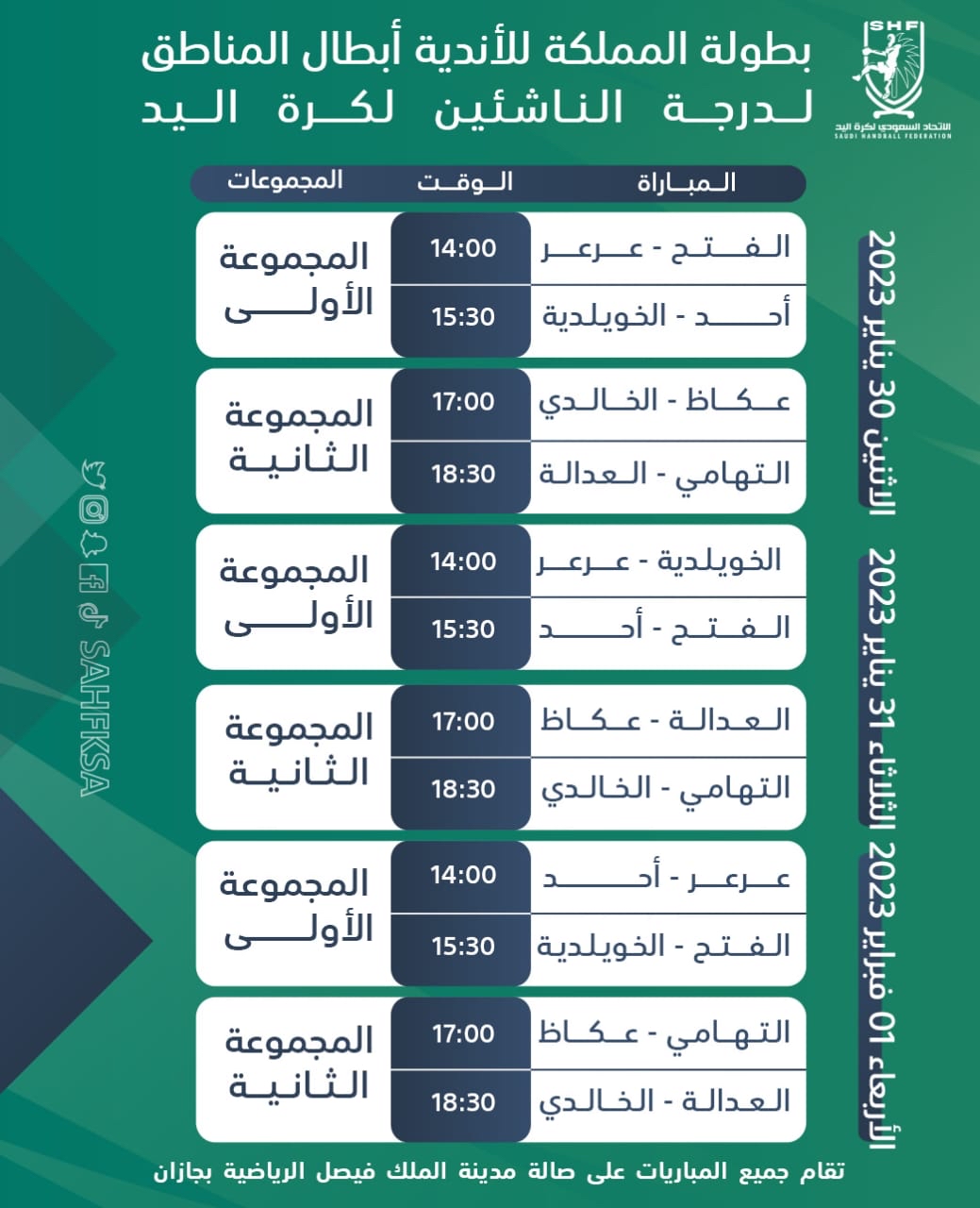 تنطلق يوم غدٍ الاثنين منافسات الأدوار النهائية من بطولة المملكة لكرة اليد للأندية أبطال المناطق لدرجة الناشئين، والمؤهلة للعب في بطولة الدوري الممتاز لدرجة الناشئين.
