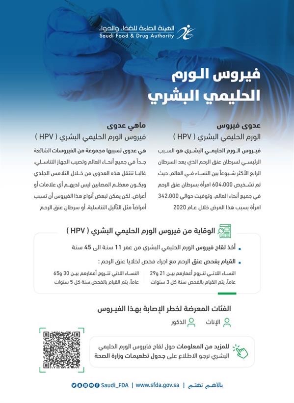 وشرحت الهيئة العامة للغذاء والدواء بالمملكة، أسباب الإصابة بعدوى فيروس الورم الحليمي البشري وكيفية التعامل معه والوقاية منه.