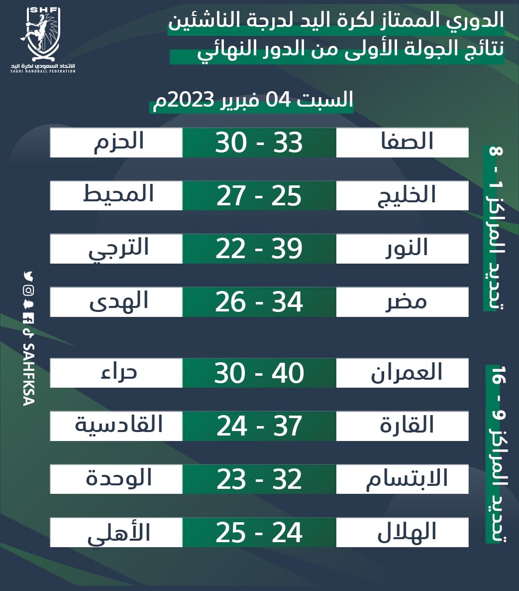 وتمكن العمران من الفوز على حراء بنتيجة «40-30»، وكسب القارة نظيره القادسية «37-24»، وحقق الابتسام الانتصار على الوحدة «32-23»، وتمكن الأهلي من خطف نقاط مواجهته مع الهلال بفارق هدف وحيد بنتيجة «24-25»، وذلك ضمن مجموعتي تحديد المراكز من «9-16».
