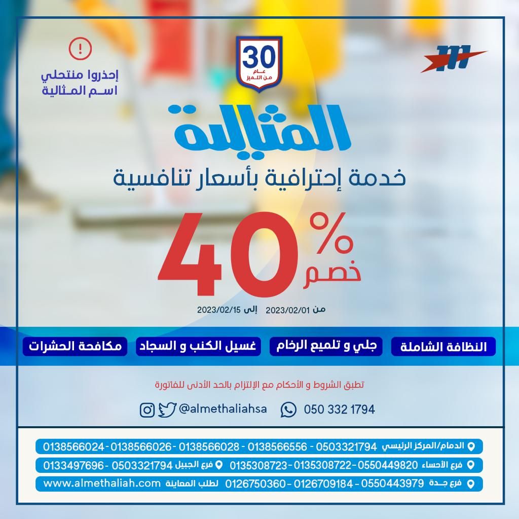 خصم 40% على كافة خدمات النظافة في شركة المثالية الدولية