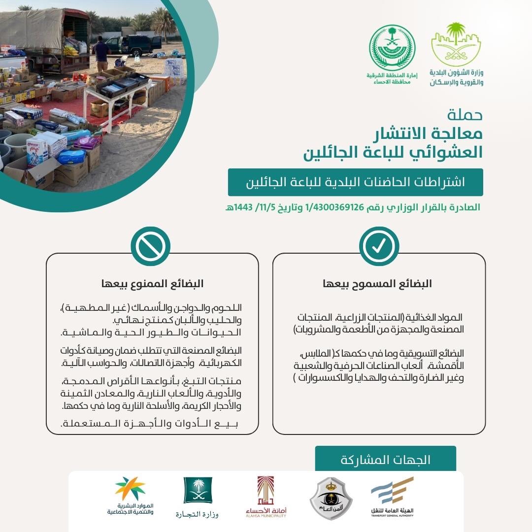 يأتي ذلك ضمن حملة معالجة الانتشار العشوائي للباعة الجائلين، التي تشنها محافظة الأحساء وفقا لاشتراطات الحاضنات البلدية الصادرة بالقرار الوزاري رقم 1/4300369126 بتاريخ 5-11/1443ه، تحت رعاية إمارة الشرقية ووزارة الشؤون البلدية والقروية والإسكان.