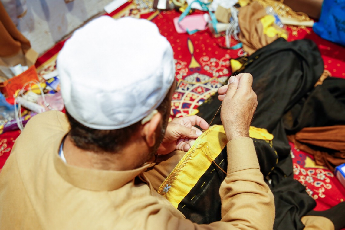 وفي الفريج التراثي، تأمل الزوار الحِرفي ”حبيب بو خضر“، 56 عامًا، في حياكته لـ ”البشت الأحسائي“، والتفاصيل الدقيقة في طريقة تصنيعه بحرفةٍ تُمثل هوية الأحساء.