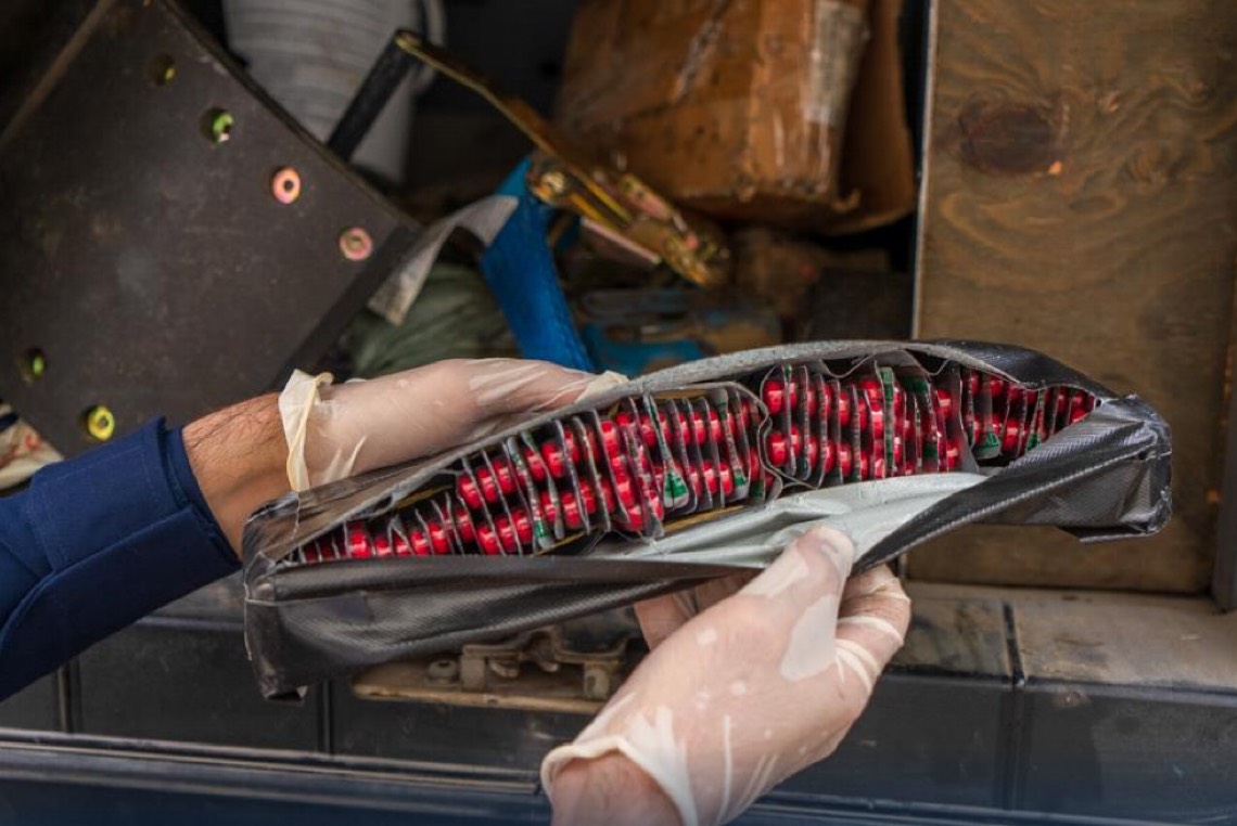 وعُثر على ”الشبو“ مُخبأة داخل طفاية الحريق الخاصة بالشاحنة، خلال خضوع إحدى الشاحنات القادمة عبر المنفذ للإجراءات الجمركية والكشف عليها عبر التقنيات الأمنية والوسائل الحية ”الكلاب البوليسية“.