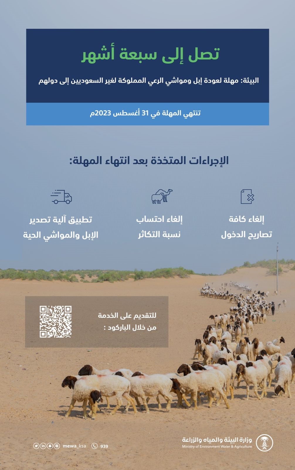 أعلنت وزارة البيئة والمياه والزراعة، عن منح مُلّاك ورُعاة الإبل والمواشي المملوكة لغير السعوديين، مهلة تصل إلى سبعة أشهر، تبدأ اليوم السبت الموافق 18 فبراير 2023م؛ لعودة إبلهم ومواشيهم الحية إلى دولهم.