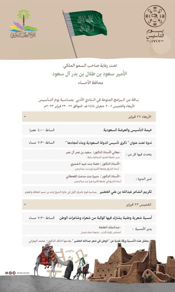 يأتي ذلك رعاية محافظ الأحساء الأمير سعود بن طلال بن بدر آل سعود، وتبدأ الفعاليات في الساعة الرابعة عصر الأربعاء، فيما تعقد ندوة على مسرح النادي تحت عنوان ”ذكرى تأسيس الدولة السعودية وبناء أمجادها“، في السابعة والنصف من مساء اليوم نفسه.