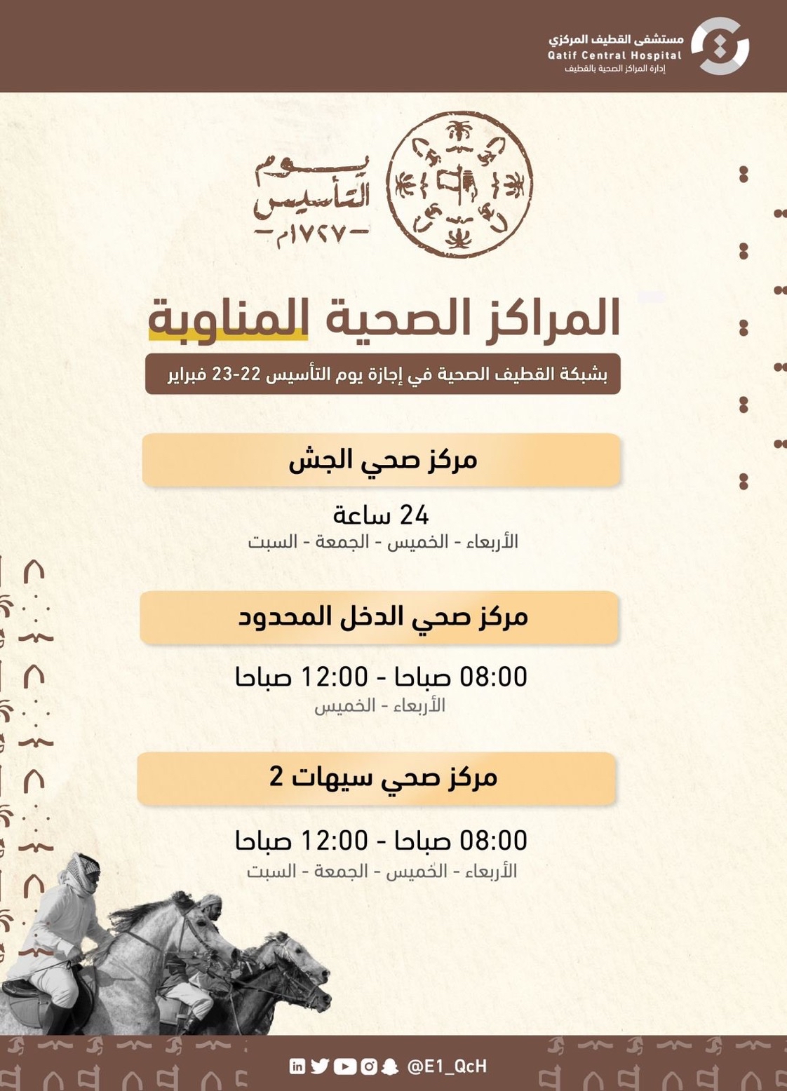 تعرف على المراكز الصحية المناوبة بالقطيف خلال إجازة يوم التأسيس