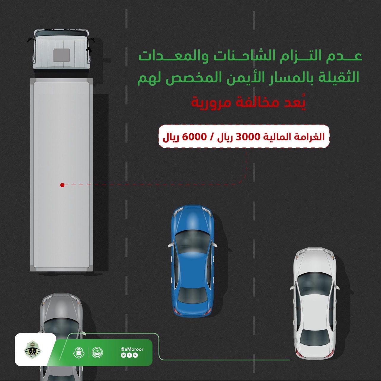 حذرت الإدارة العامة للمرور من أن عدم التزام الشاحنات والمعدات الثقيلة بالمسار الأيمن المخصصة يُعد مخالفة مرورية وغرامتها المالية من 300 إلى 6000 ريال.