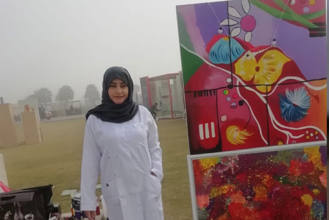وذكرت أن الفن التجريدي يشعرها بالارتياح الأكثر لان كل مايرسم ويلون باللوحة يكون نابع من داخل النفس عما يشعر به الفنان يخرجه مباشرة للوحة فنية.