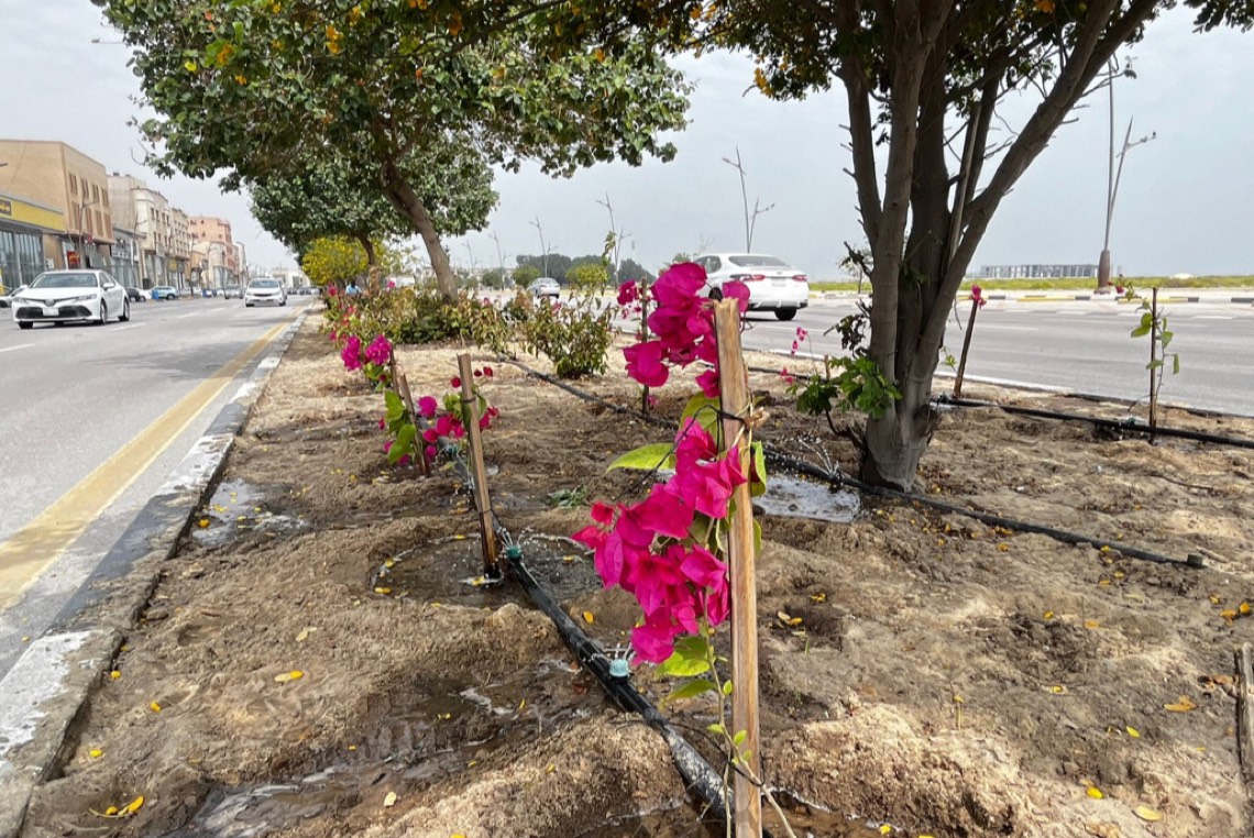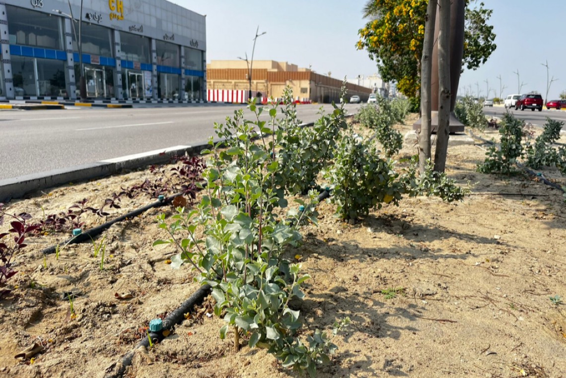 وتتضمن الأعمال زراعة 24 ألف شجيرة منوعة دائمة من الجهنميات المكبسة والرغل والأرسين المناسبة لمناخ المنطقة ومن مختلف الأشجار المزهرة، وتم استكمال 75 % من أعمال الزراعة والتشجير لطريق الخليج العربي.