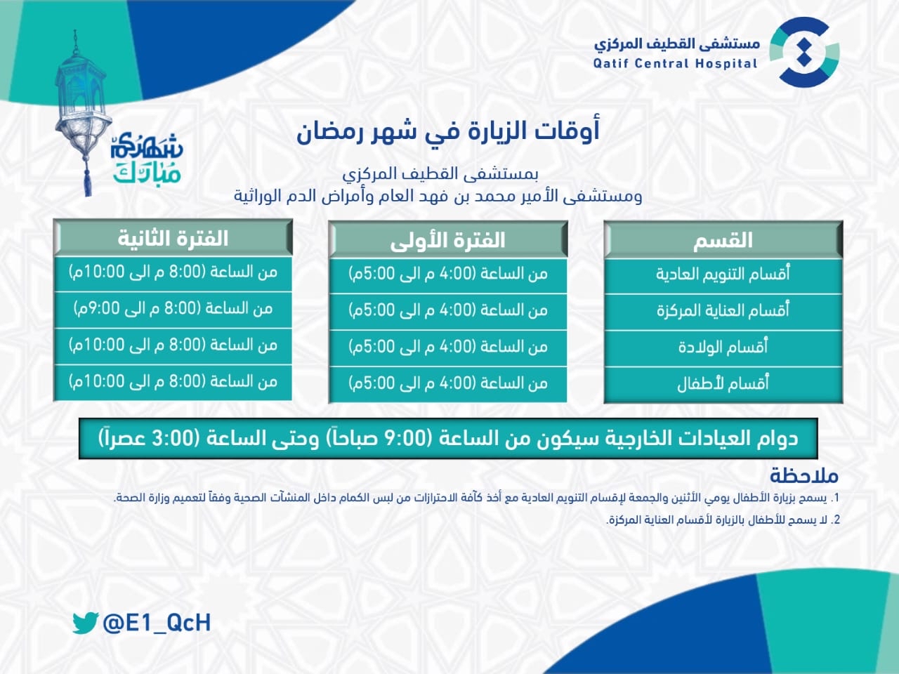 أعلنت شبكة القطيف الصحية عن أوقات الزيارة خلال شهر رمضان المبارك لكل من مستشفى القطيف المركزي ومستشفى الأمير محمد بن فهد العام وأمراض الدم الوراثية وكذلك أوقات عمل المراكز الصحية بالقطيف خلال الشهر الكريم.