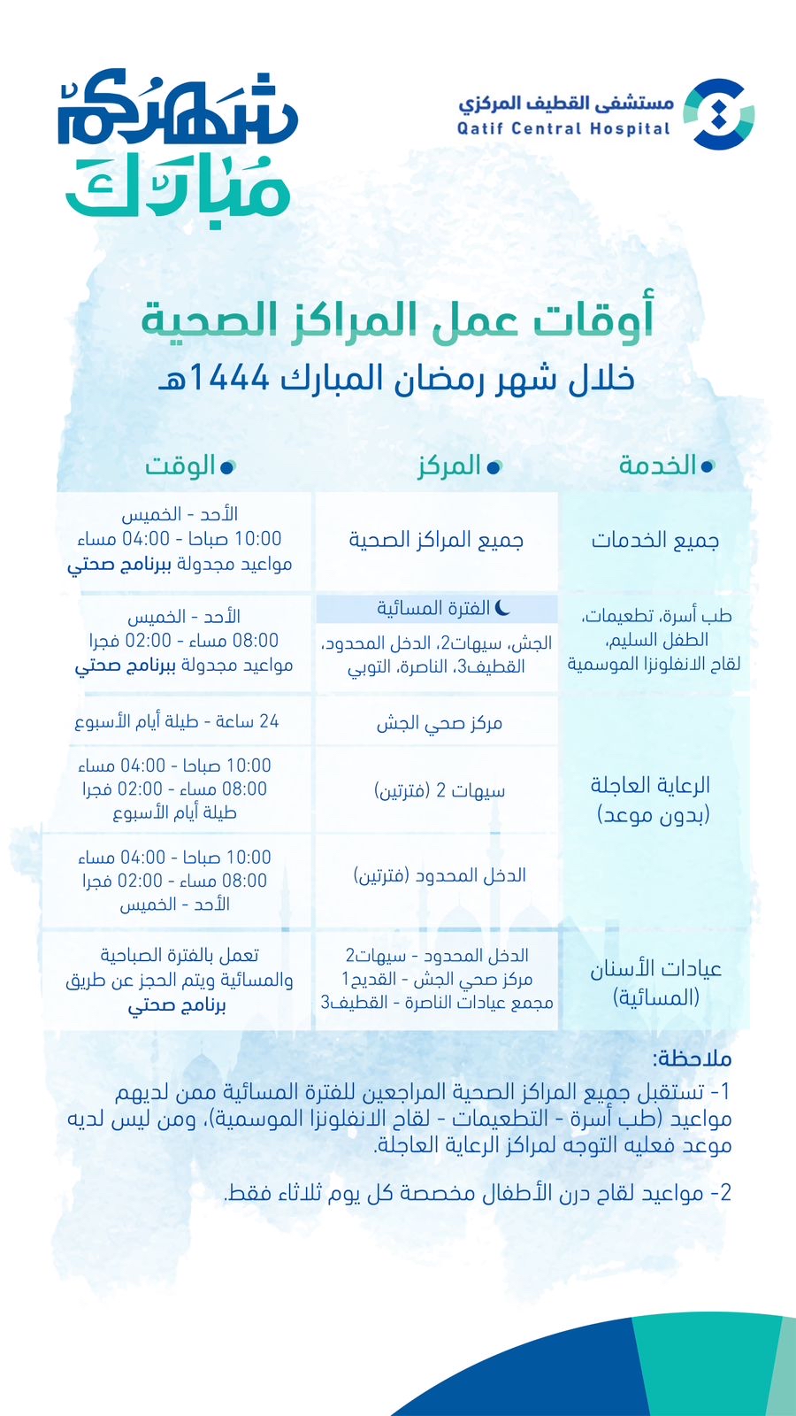وبشأن مواعيد المراكز الصحية ي شهر رمضان فقد أوضحت شبكة القطيف الصحية فسيكون عمل المراكز الصحية بالقطيف من 10 صباحاً حتى 4 مساءً من الأحد للخميس طبقاً للمواعيد المجدولة في تطبيق «صحتي».