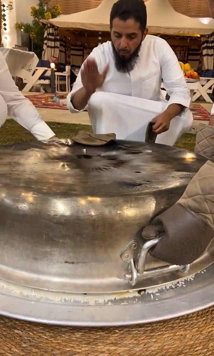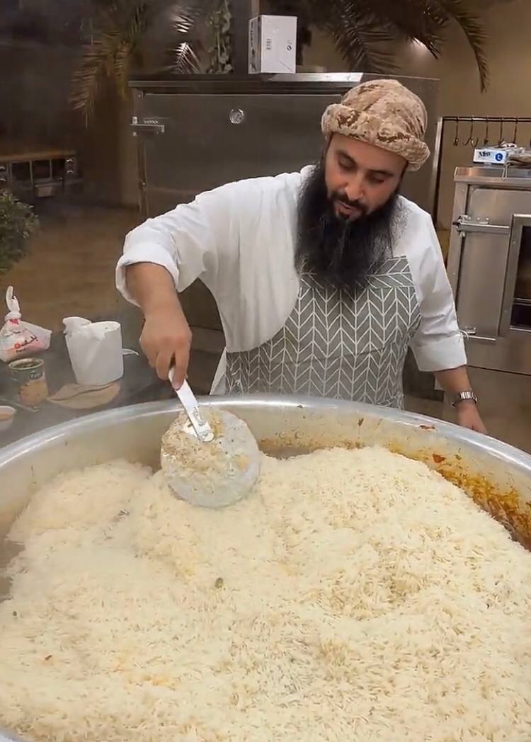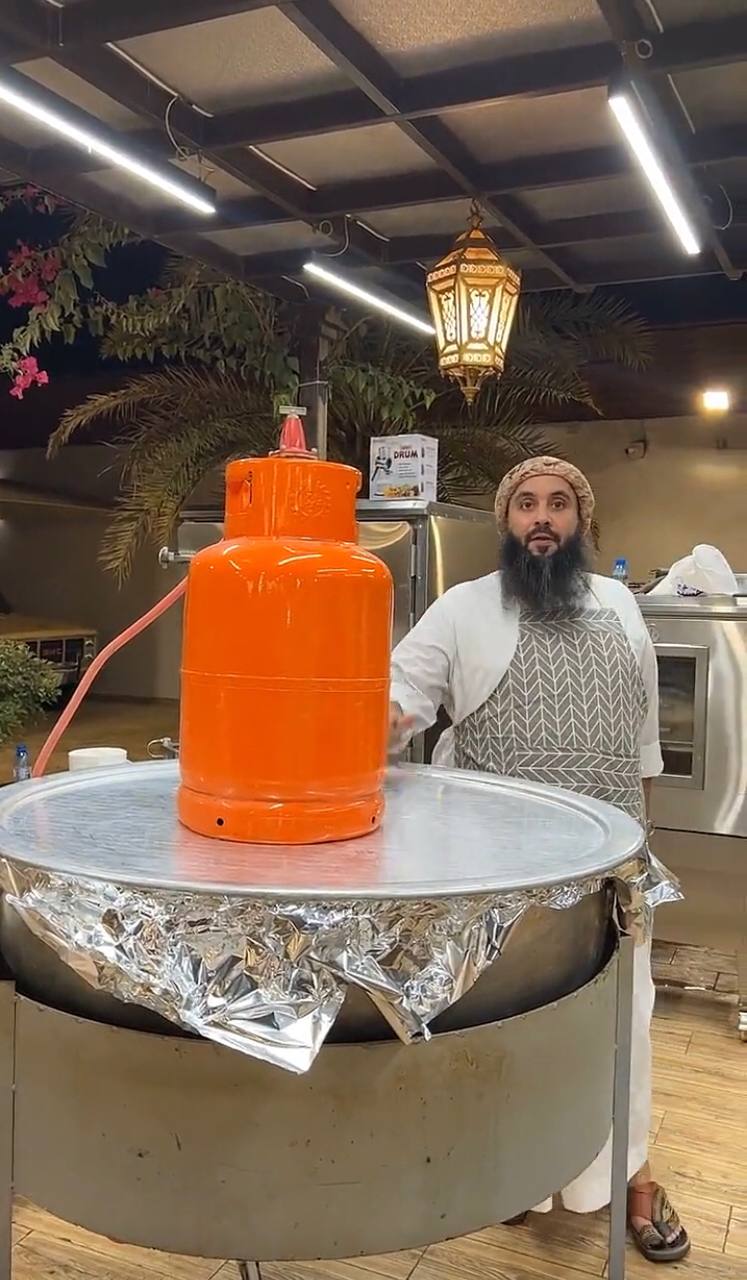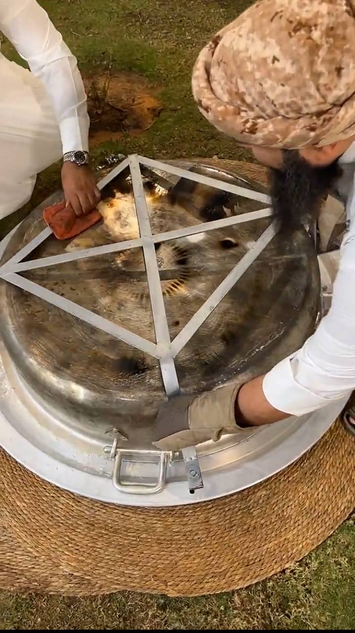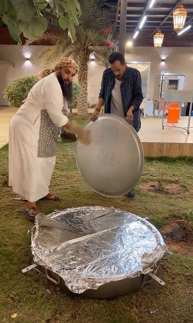 وبادر مجموعة من أقربائه في مساعدته لصنع قاعدة حديدية تتمكن من حمل القدر قبل قلبه بمكوناته في الطبق، والذي وصل وزنه إلى قرابة 250 كيلو جرام.