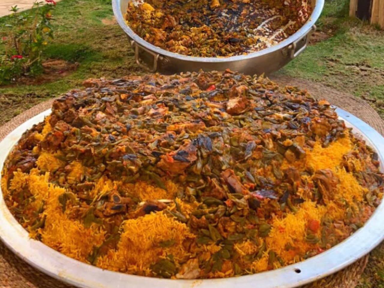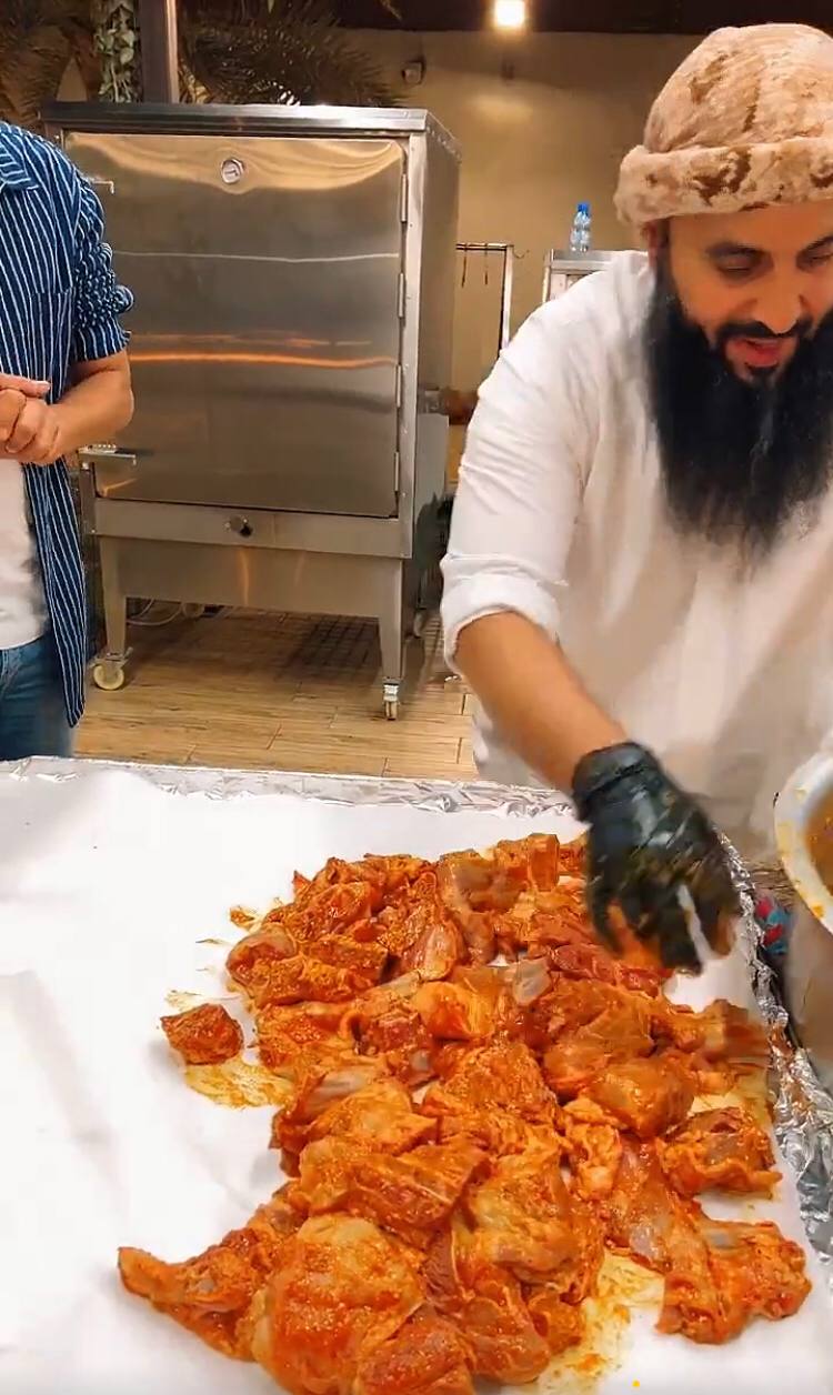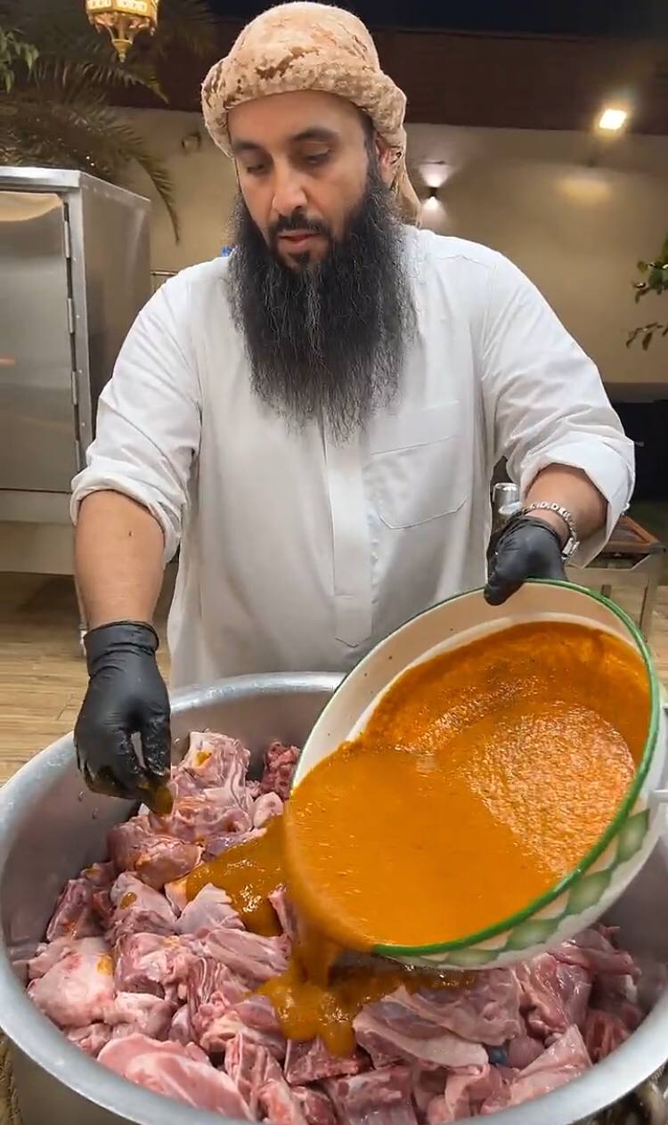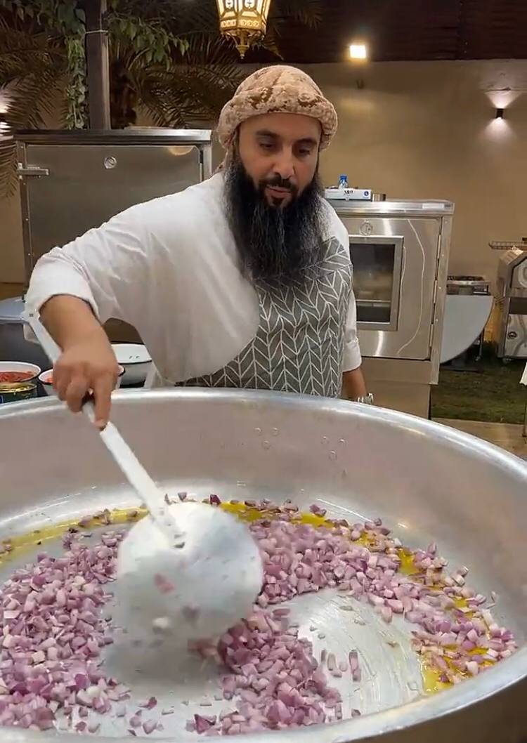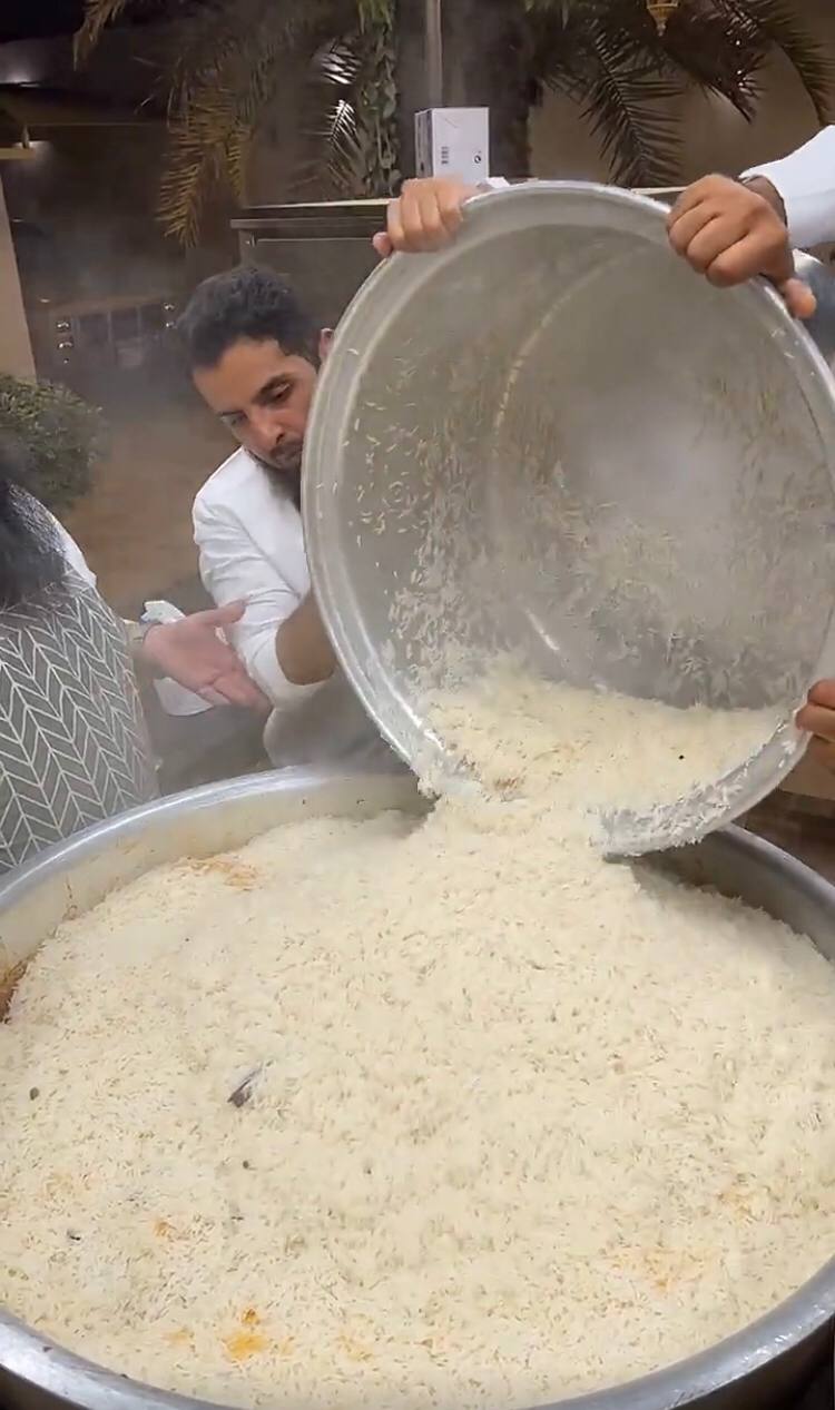 وبادر مجموعة من أقربائه في مساعدته لصنع قاعدة حديدية تتمكن من حمل القدر قبل قلبه بمكوناته في الطبق، والذي وصل وزنه إلى قرابة 250 كيلو جرام.
