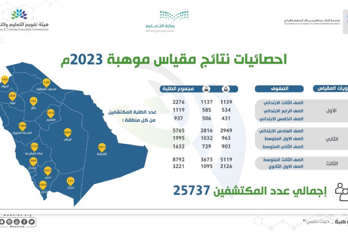 وبلغ عدد الموهوبين المكتشفين على مستوى المملكة للعام 2023م: 25737 طالبا وطالبة من بين إجمالي عدد المسجلين البالغ 60588، من بينهم 52588 طالبا وطالبة ممن أدوا مقياس موهبة، وفق مؤسسة موهبة، والتي أعلنت نتائجها يوم الثلاثاء الماضي.