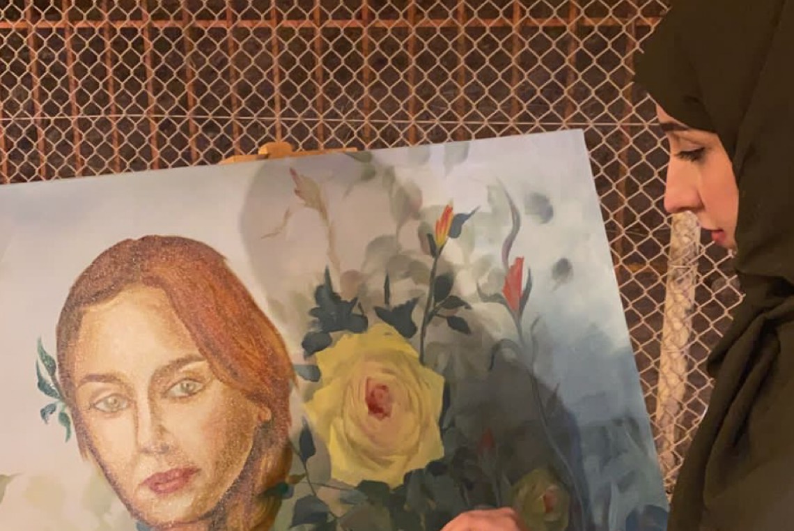 وأوضحت أنه لوحتها تبرز أجمل ما في البساتين وهي الورود والزهور، ورسمت معها المرأة أو العروس ومن ضمن زينتها حنة الشعر وكحل العين وتزين الشعر بالمشموم والورود.