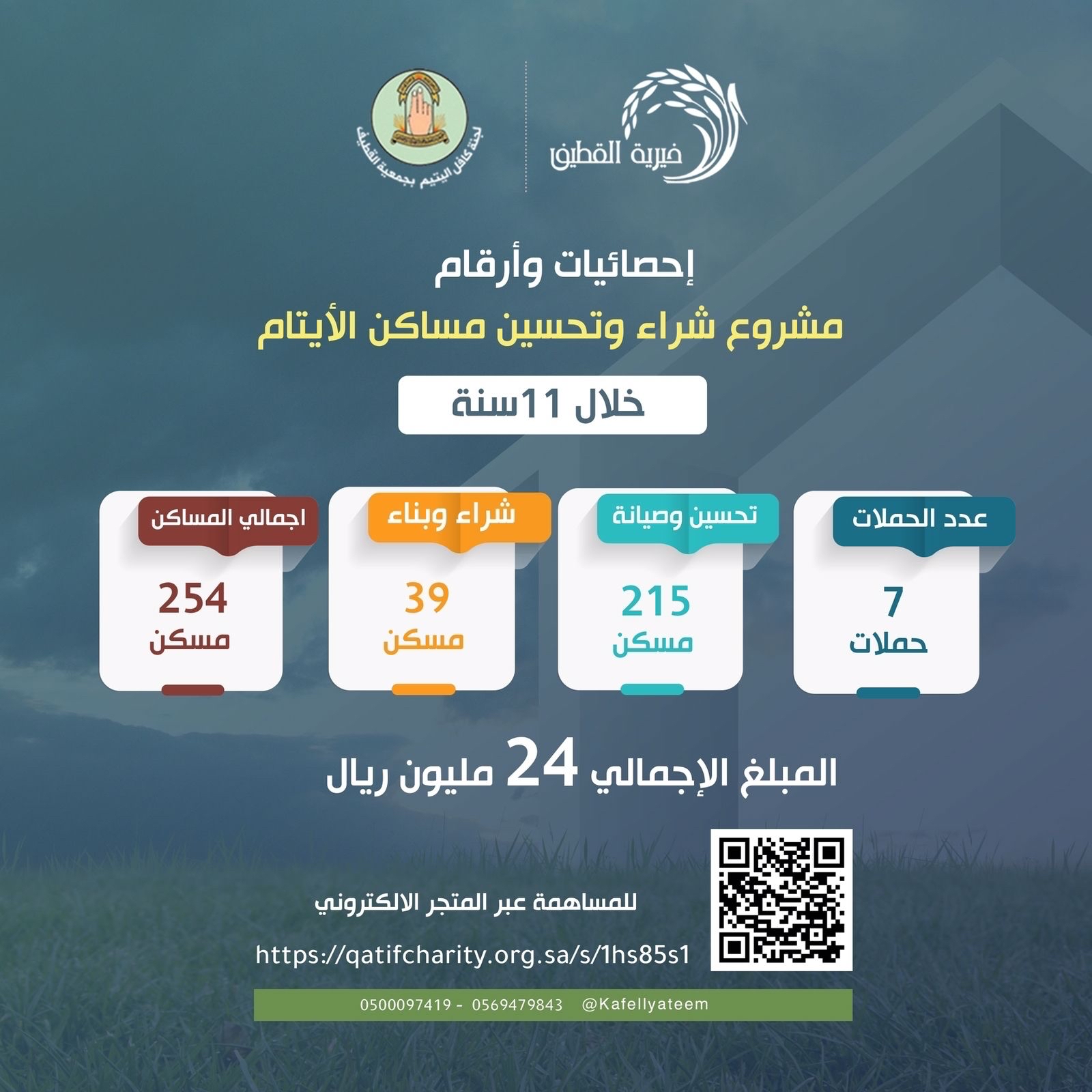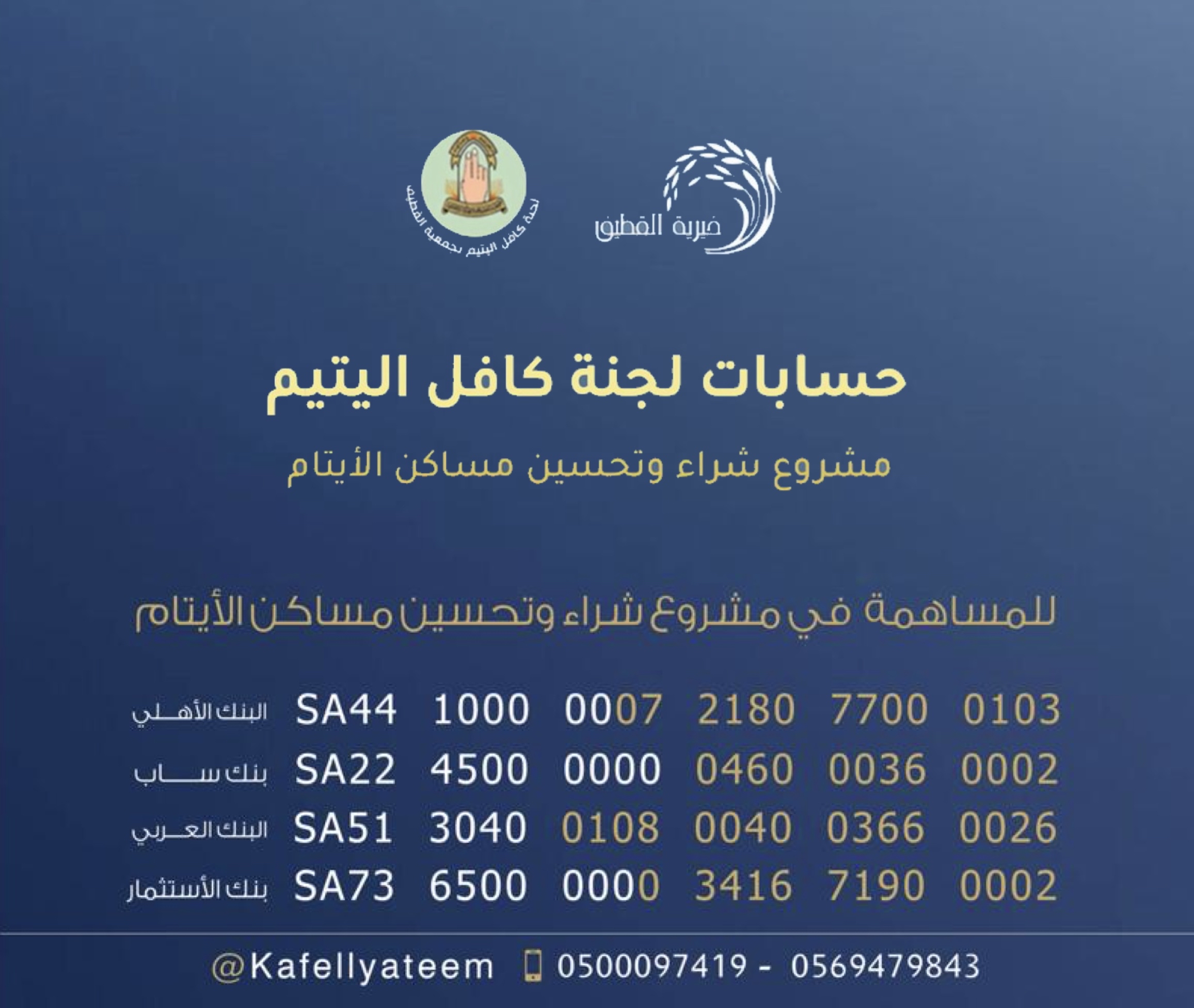 ودعت الجمعية المحسنين الراغبين بالإسهام والتبرع لمبادرة شراء مساكن للأيتام، إلى زيارة مكاتب الجمعية، أو الإيداع البنكي في حسابات لجنة كافل اليتيم الموجودة في الإعلان، أو عبر المتجر الالكتروني https://www.qatifcharity.org.sa/projects/مشروع - تحسين - مساكن - للأيتام/