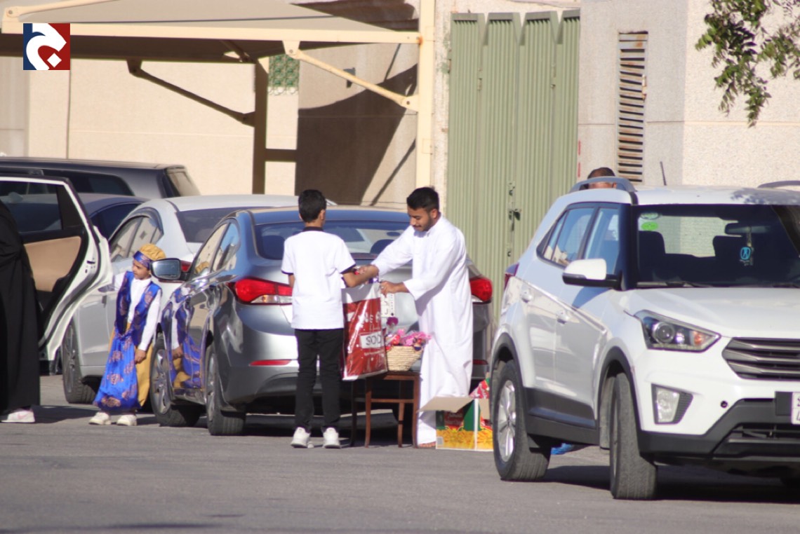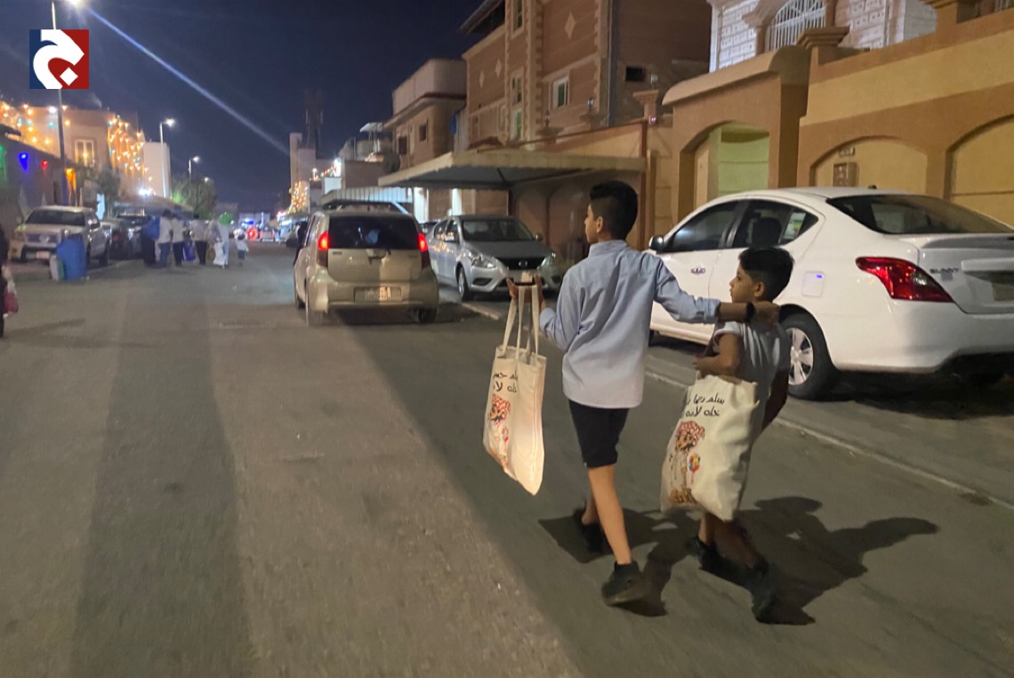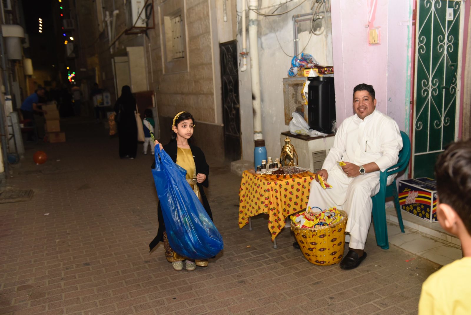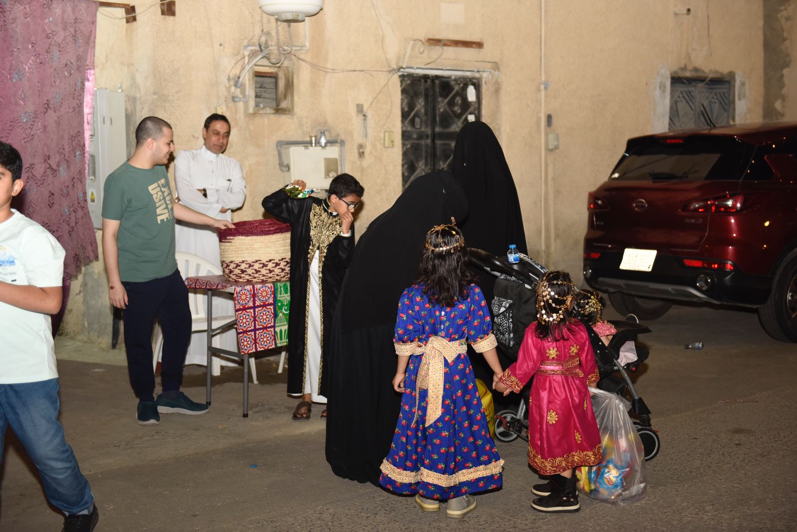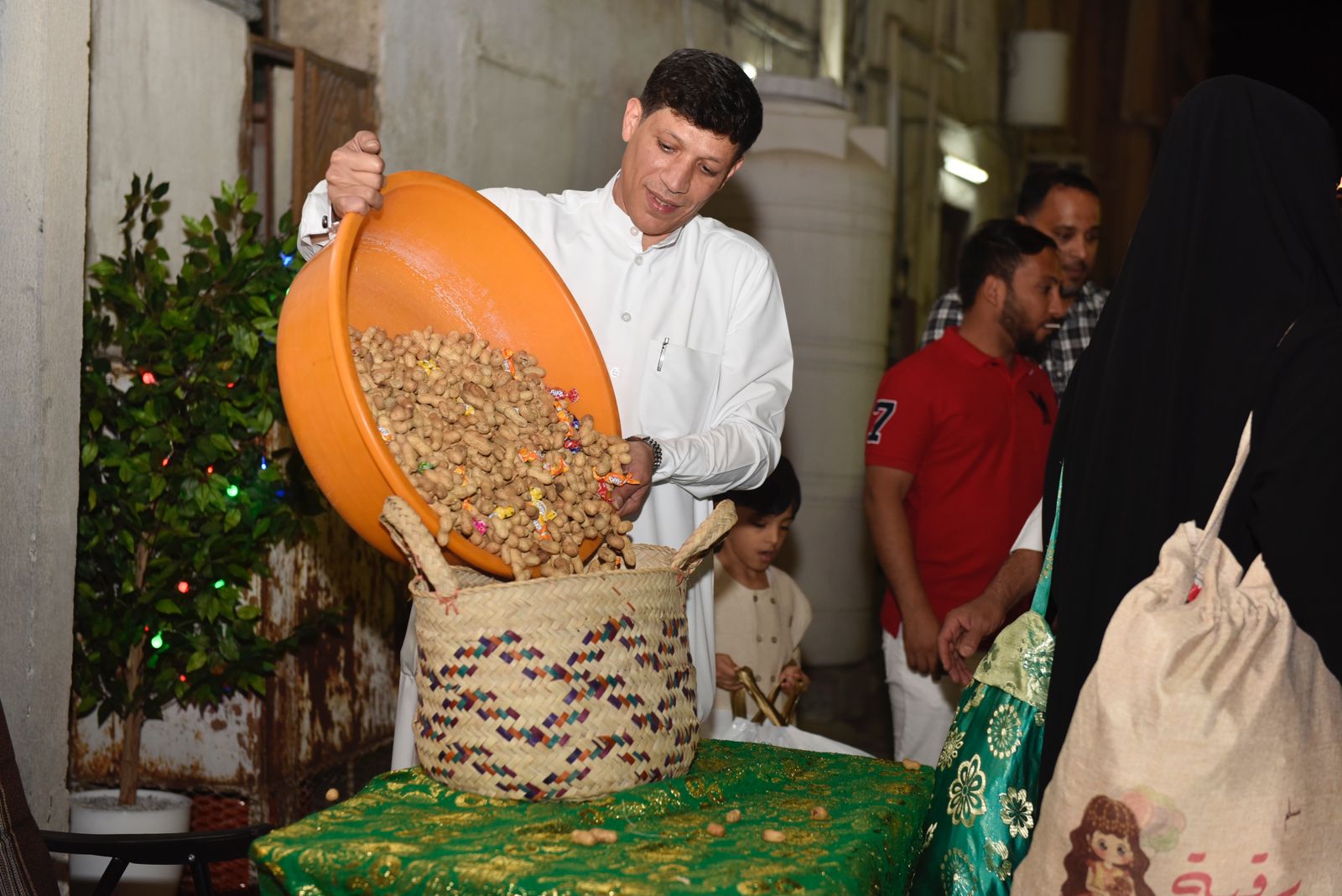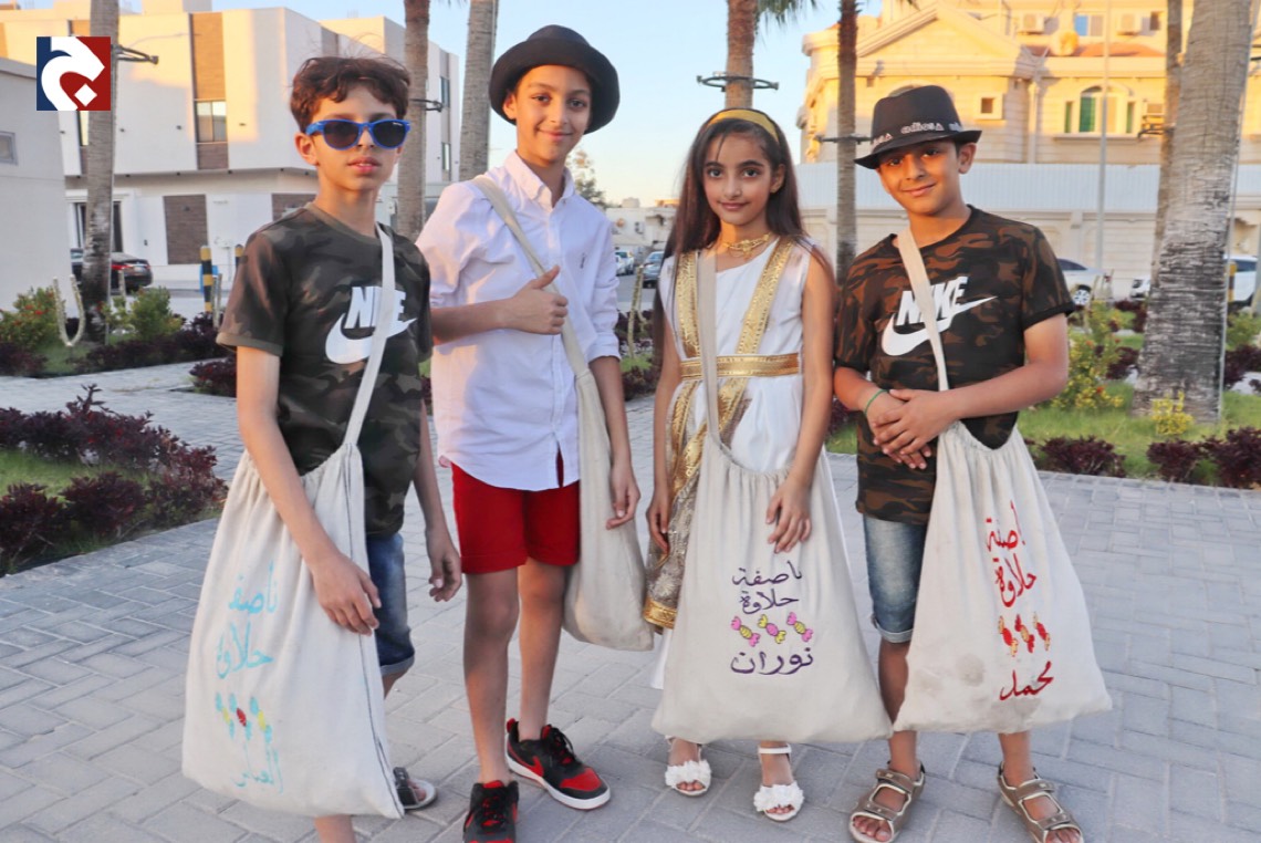 وردد الاطفال حاملين أكياس مزكرشة، وحلويات ملونة، هتافات وأهازيج ب «ناصفة حلاوة.. عطونا الله يعطيكم.. سلم الله أبو عيالكم». فيما حرصت الأمهات على توزيع الحلوى عند أبواب منازلهن.