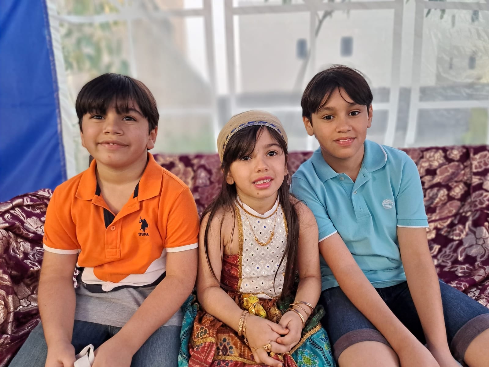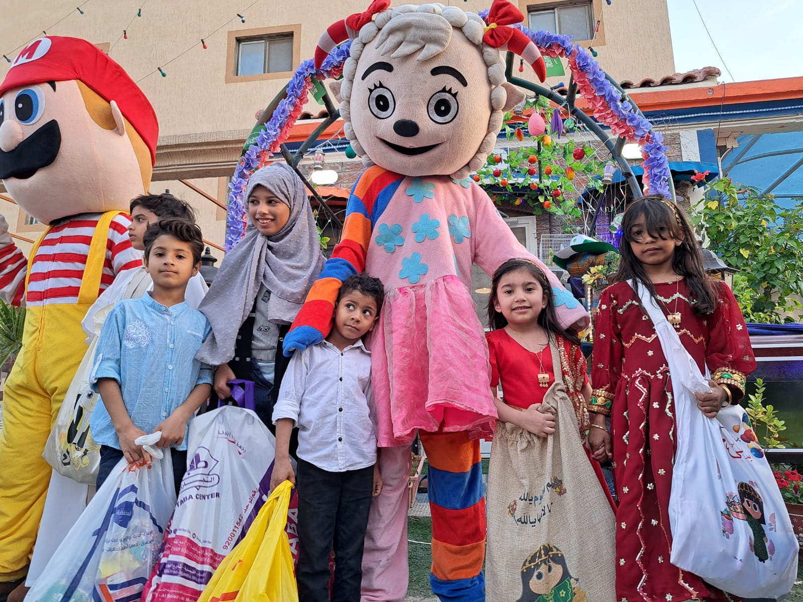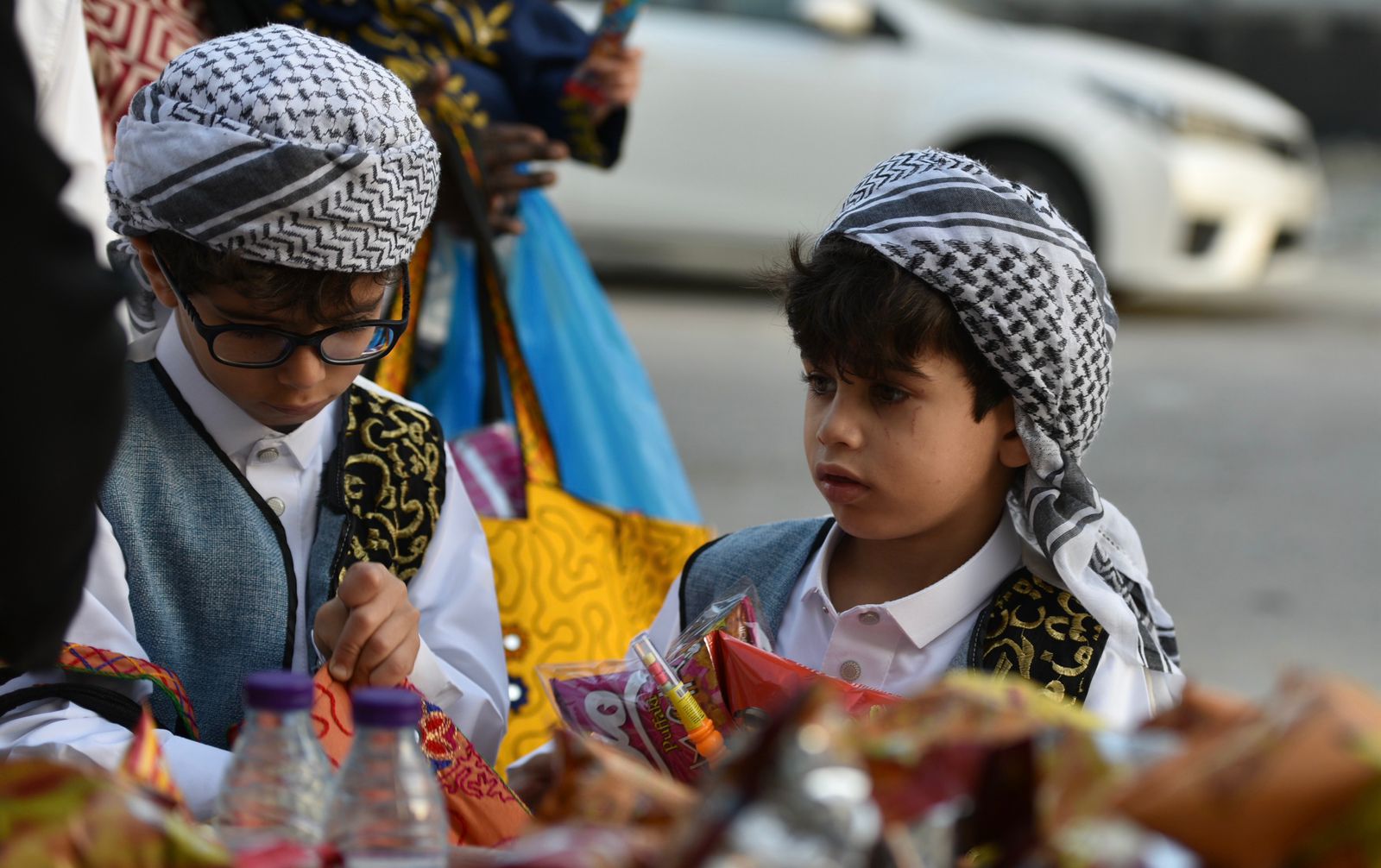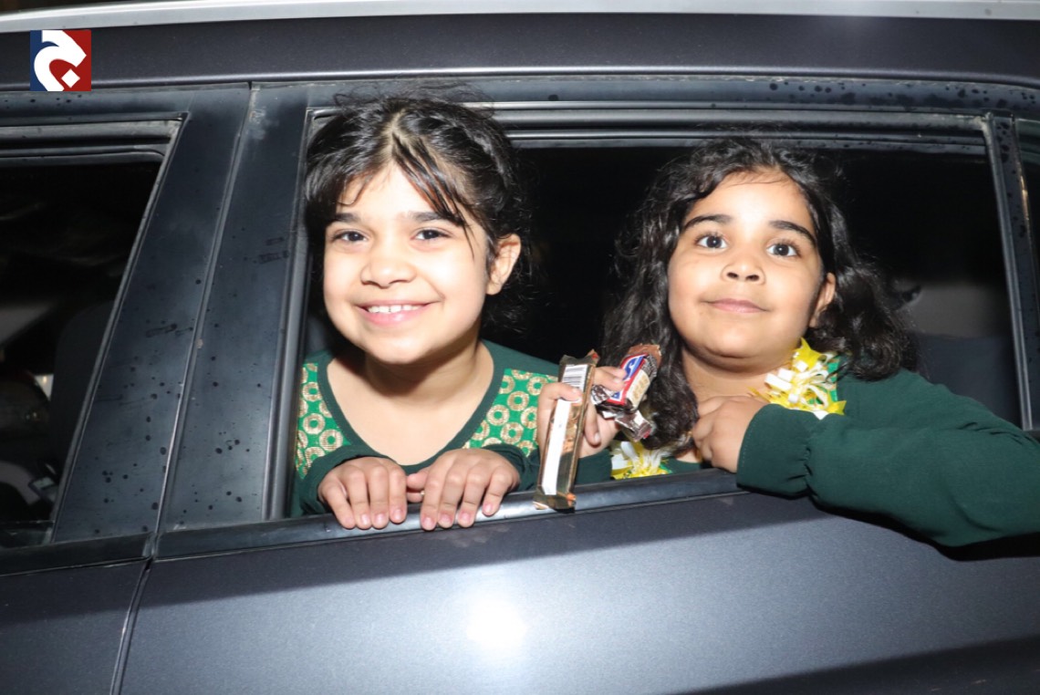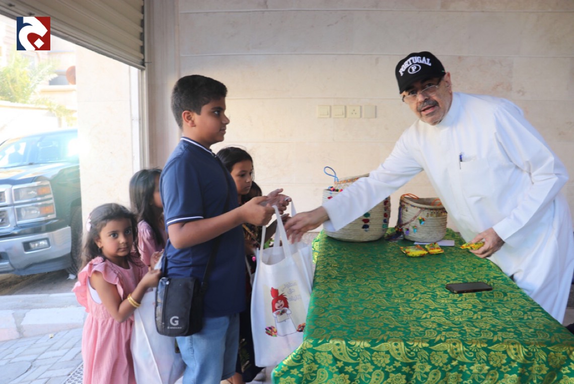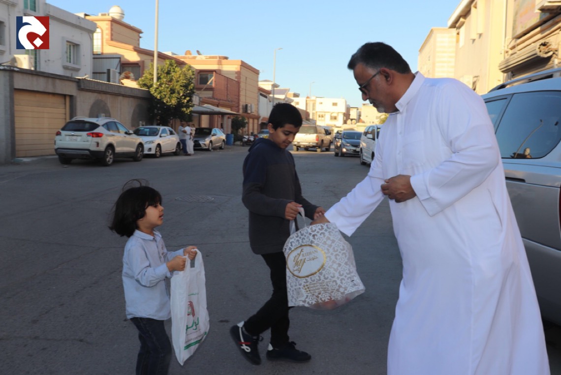 وردد الاطفال حاملين أكياس مزكرشة، وحلويات ملونة، هتافات وأهازيج ب «ناصفة حلاوة.. عطونا الله يعطيكم.. سلم الله أبو عيالكم». فيما حرصت الأمهات على توزيع الحلوى عند أبواب منازلهن.